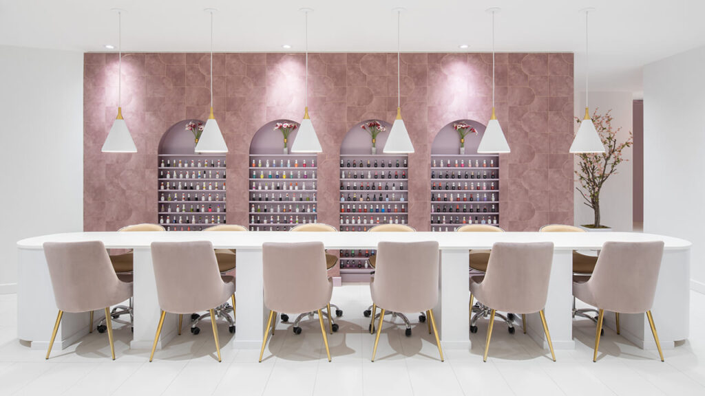 Des espaces de présentation font un clin d’œil à la forme des ongles par la création d’arches. Ces rangements encastrés ont pour but de mettre de l’avant la grande sélection de couleurs de vernis qu’offre le salon. Les tables de travail faites sur mesure se veulent un parfait rappel de cette courbe. Dans l’ensemble, le projet est à l’image de ses propriétaires, soit accessible et invitant.