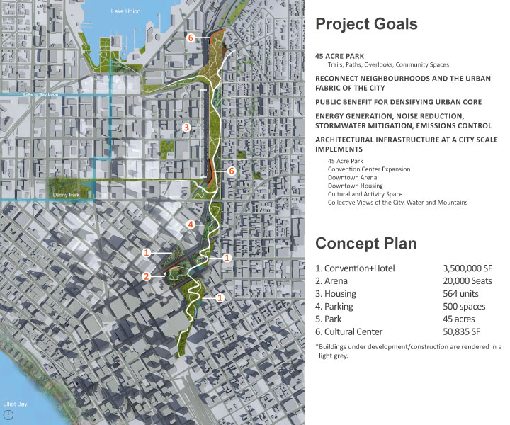 Autre projet qui a fait jaser ces derniers jours: le recouvrement de l’Interstate 5, à Seattle. Un groupe d’architectes locaux, Patano Studio, a dévoilé un concept de recouvrement d’autoroute qui permettrait de consolider le tissu urbain en créant un parc linéaire, du logement et des infrastructures culturelles.