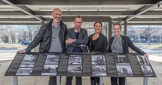 Pierre L’Heureux, conseiller d’arrondissement, Éric Gauthier, architecte de la firme Les Architectes FABG, Manon Gauthier, conseillère de Ville et membre du comité exécutif de la Ville de Montréal, et Marie-Eve Brunet, conseillère d’arrondissement, devant le panneau d’interprétation historique de La Station. Crédit photo: Éric Varasifsky