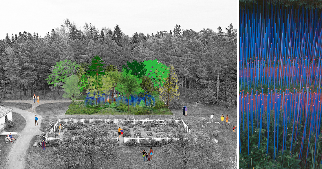 Le projet met en vedette de façon permanente le Jardin de bâtons bleus, métamorphose pixélisée du célèbre pavot bleu de l’Himalaya soigneusement acclimaté et cultivé à Métis par Elsie Reford, à l’intérieur d’un nouvel écosystème : une microforêt composée d’essences végétales de zones climatiques plus chaudes qui ceinture et pénètre l’ensemble des 2500 bâtons bleu et orange.