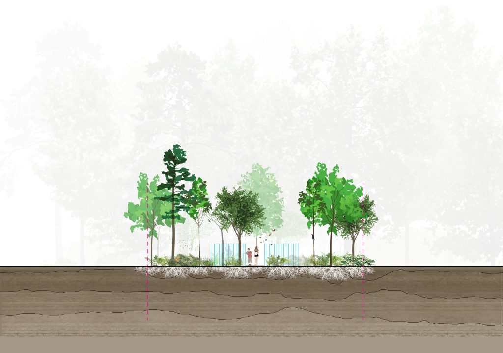 Inspirée des méthodes de plantation innovantes de microforêts développées par le botaniste japonais Akira Miyawaki, la Forêt se compose de 1800 spécimens d’arbres, arbustes et vivaces plantés densément, prêts à décupler leurs propriétés de manière symbiotique et à croître à un rythme étonnant.