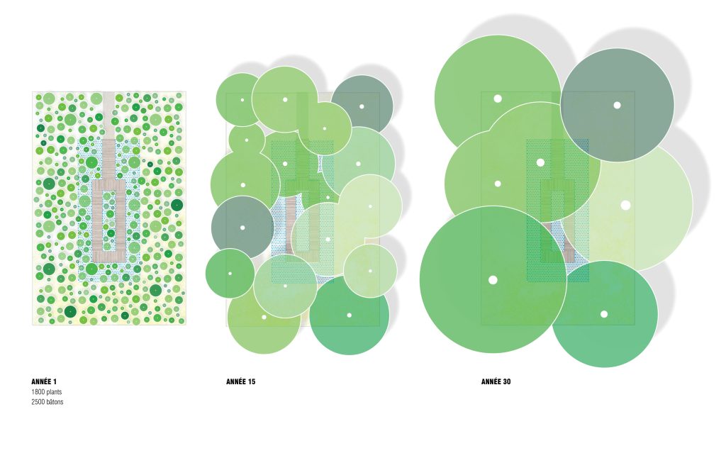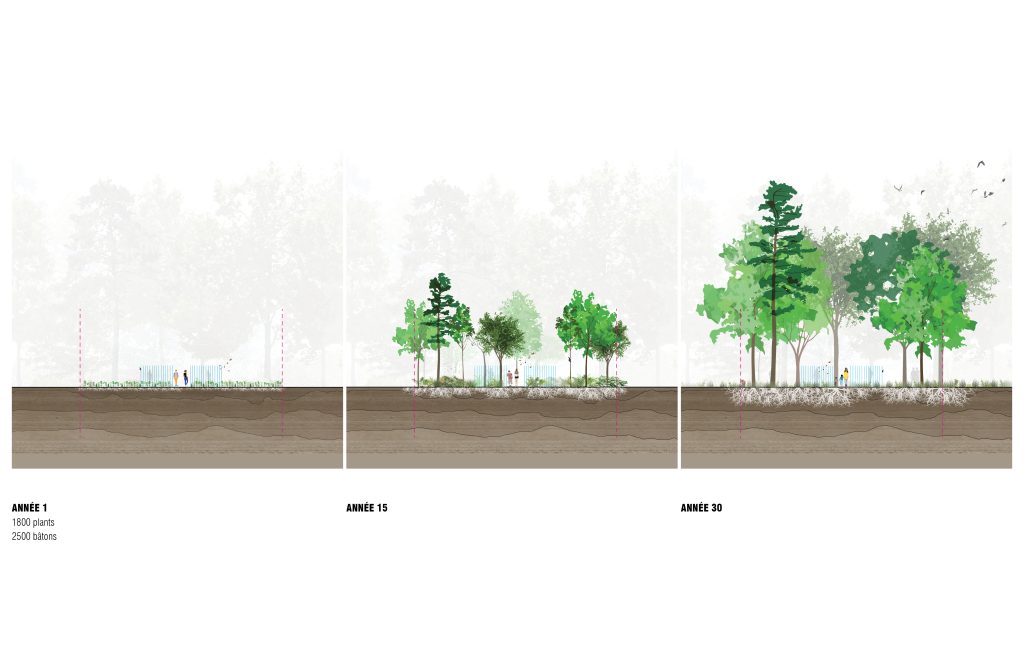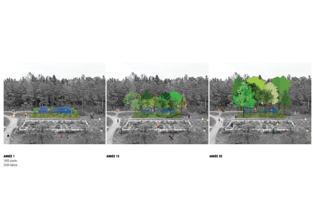 S’appuyant sur le récent constat du recul des zones de rusticité en Amérique du Nord (au rythme d’un quart à une demi-zone par décennie), les familles végétales indigènes d’aujourd’hui sont rejointes par celles de demain (érable à sucre, chêne, févier, etc.), capturant ainsi le portrait généalogique d’une nouvelle forêt déjà en route dans l’est du Québec. La migration assistée des essences végétales confère au jardin une volonté accrue de résilience et d’optimisme, et affirme notre devoir collectif d’agir sur notre environnement déjà si fragilisé.
