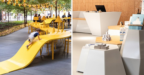GAUCHE : Installation « Prenez place! » par ADHOC architectes en collaboration avec Maude Lescarbeau et Camille Blais | Crédit photo : Raphaël Thibodeau | DROITE : Boutique du Biodôme de Montréal par ADHOC architectes en collaboration avec MESSIER designers | Crédit photo : Raphaël Thibodeau