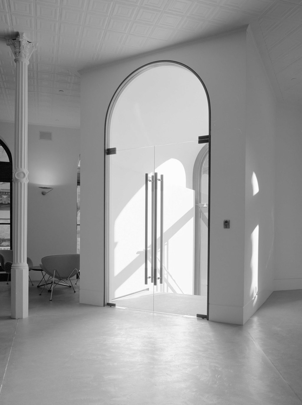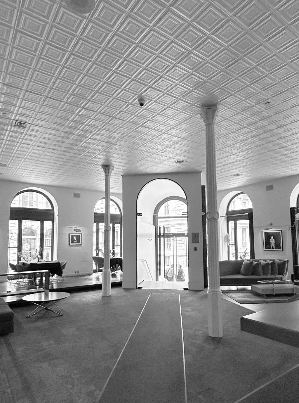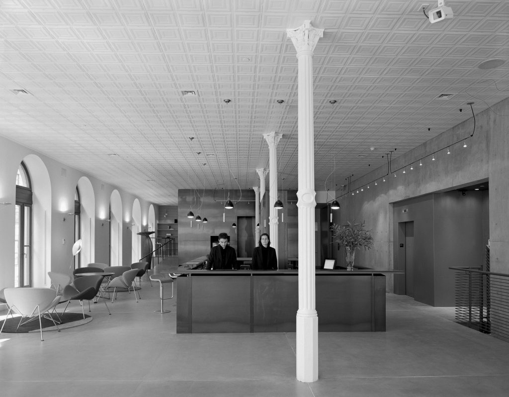 Pour redonner au lobby son ambiance singulière, l’éclairage joue un rôle central. Un travail sur la lumière indirecte met en valeur les éléments clés : arches, plafond à caissons métalliques, textures. Au cœur de l’espace prend place une boite de verre translucide abritant le bar et le bureau de service, véritable lanterne diffusant une lumière douce dans toutes les directions.