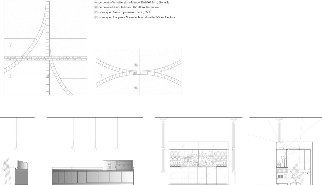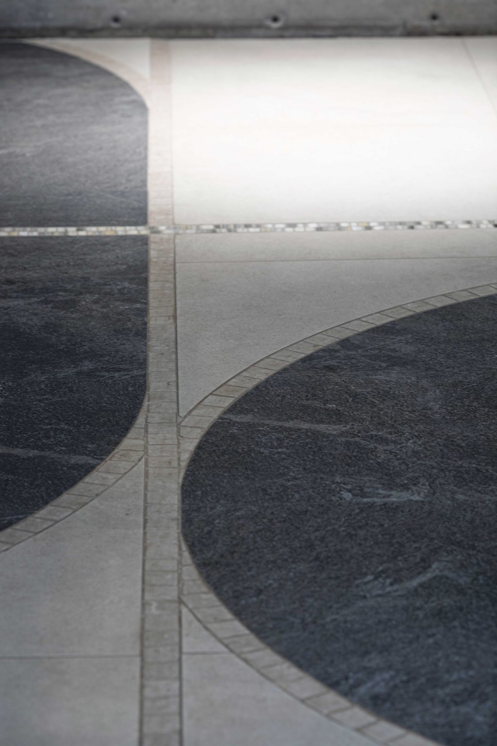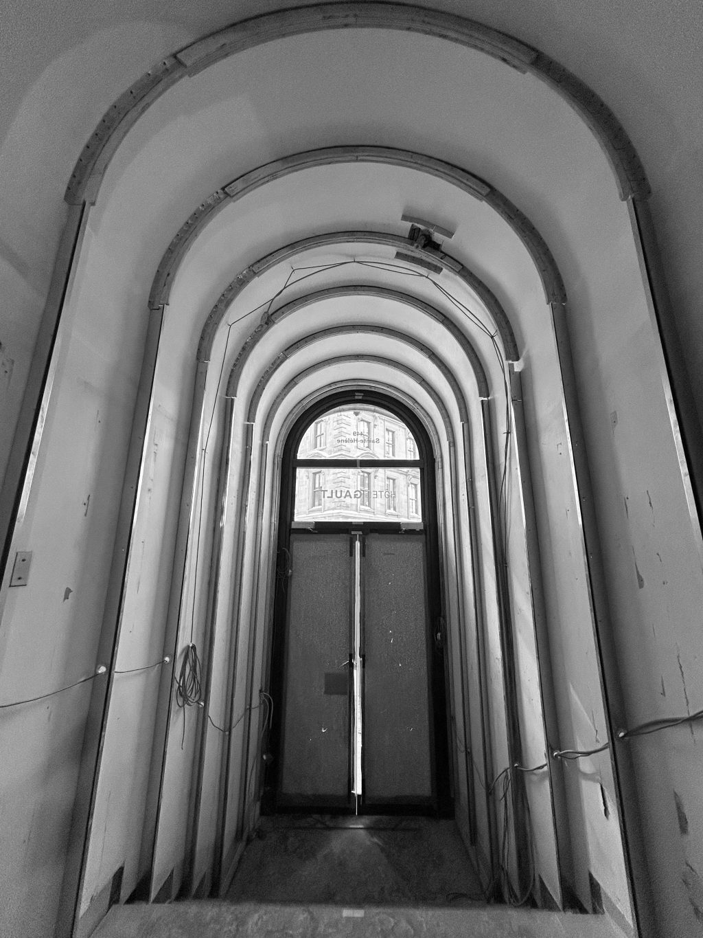 La matière, déjà au cœur du premier projet, prend ici une nouvelle dimension. Le vestibule est désormais habillé d’une voute en bois massif d’acajou cintré, écho aux arcs des fenêtres existantes. Celle-ci marque la transition entre la rue animée et l’intérieur feutré de l’hôtel. Au sol, l’ancienne chape de béton laisse place à un nouveau motif composé de mosaïque, pierre et céramique. Ses courbes font écho aux arches du bâtiment et adoucissent les lignes rigoureuses de l’architecture.