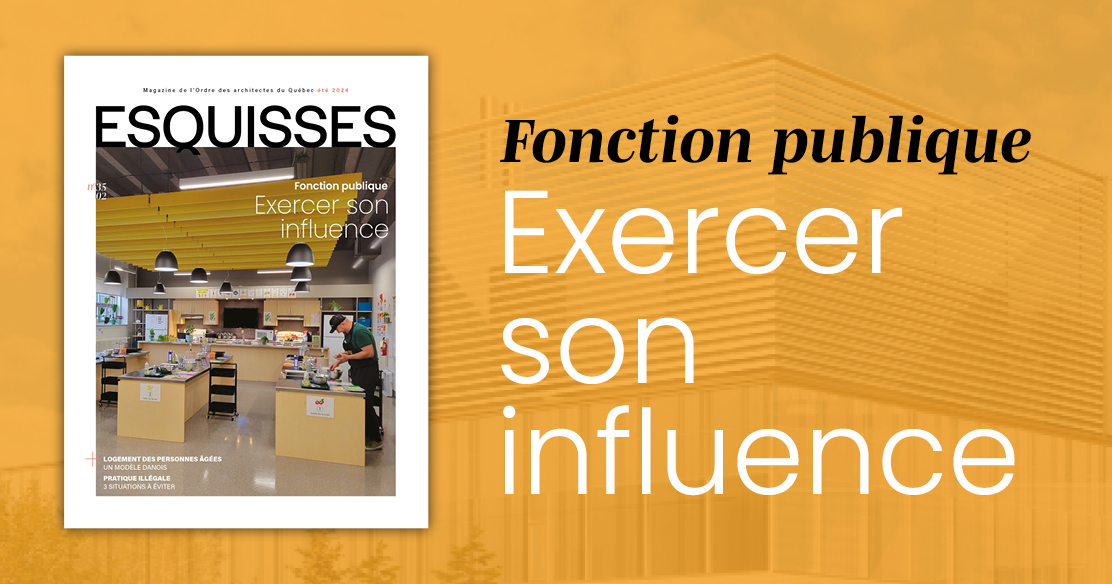 « Dans son numéro de l’été 2024, Esquisses donne la parole à huit architectes de la fonction publique municipale, provinciale et fédérale afin de mettre en lumière une pratique différente de celle dans les cabinets d’architecture. Une pratique qui fait davantage appel à la gestion qu’à la conception architecturale et qui se révèle essentielle à planification et la qualité des projets publics. Diriger des équipes multidisciplinaires, conseiller les instances et surtout contribuer au bien commun font partie des motivations de ces architectes qui travaillent « de l’autre côté ».