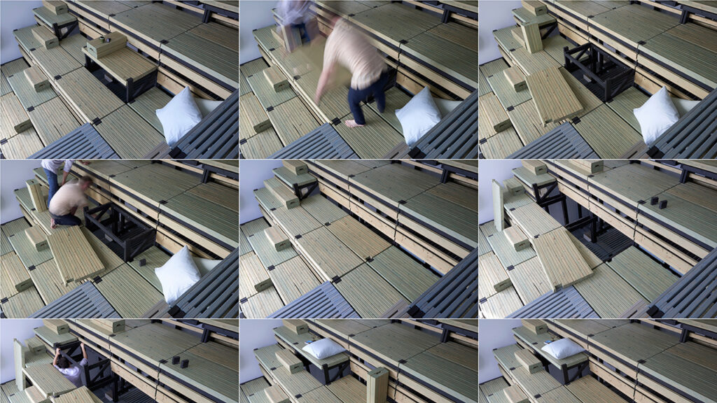 Deux gradins de bois, se croisant à angle droit, sont construits dans l’espace principal. Ils sont à la fois mobilier surdimensionné, agora, circulations, filtres, parois, bibliothèques, supports, etc. Ils peuvent être modifiées à trois niveaux : blocs libres déplaçables à volonté (servant de table d’appoint, de dossier, de marche, etc.), paliers intermédiaires boulonnés à la structure principale et permettant des reconfigurations régulières, et l’ensemble des gradins, uniquement déposé sur la dalle de béton, qui peut être reconstruit de manière entièrement différente.