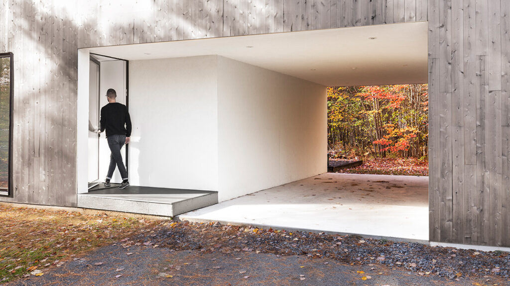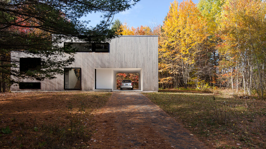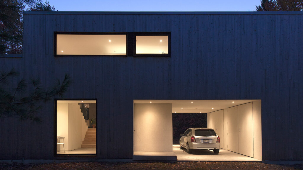 L’extérieur, entièrement revêtu de clin de cèdre de l’est laissé naturel grisaillera avec le temps afin de s’estomper et s’apparenter d’avantage à l’écorce des arbres environnants. De simples ouvertures, entourées de cadres noirs, ponctuent le volume minimaliste de la maison. Donnant l’impression d’avoir été évidé, l’ancien garage a fait place à un espace de stationnement couvert et traversant. Cette perforation crée une transparence qui, tout comme les grandes ouvertures, laisse toute la place à la nature.