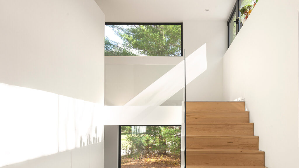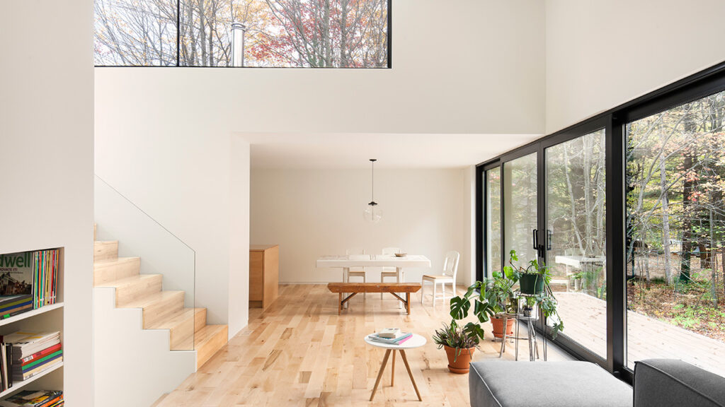De l’intérieur, la maison s’ouvre complètement à la nature pour offrir aux occupants des vues sur un tableau en constante évolution. La blancheur des espaces intérieurs joue le rôle de canevas, accueillant les couleurs du paysage extérieur au fil des saisons, permettant d’expérimenter autrement les lieux de vie continuellement changeants. L’ambiance créée par l’amalgame sobre de matériaux et textures confère à la maison une beauté intemporelle.