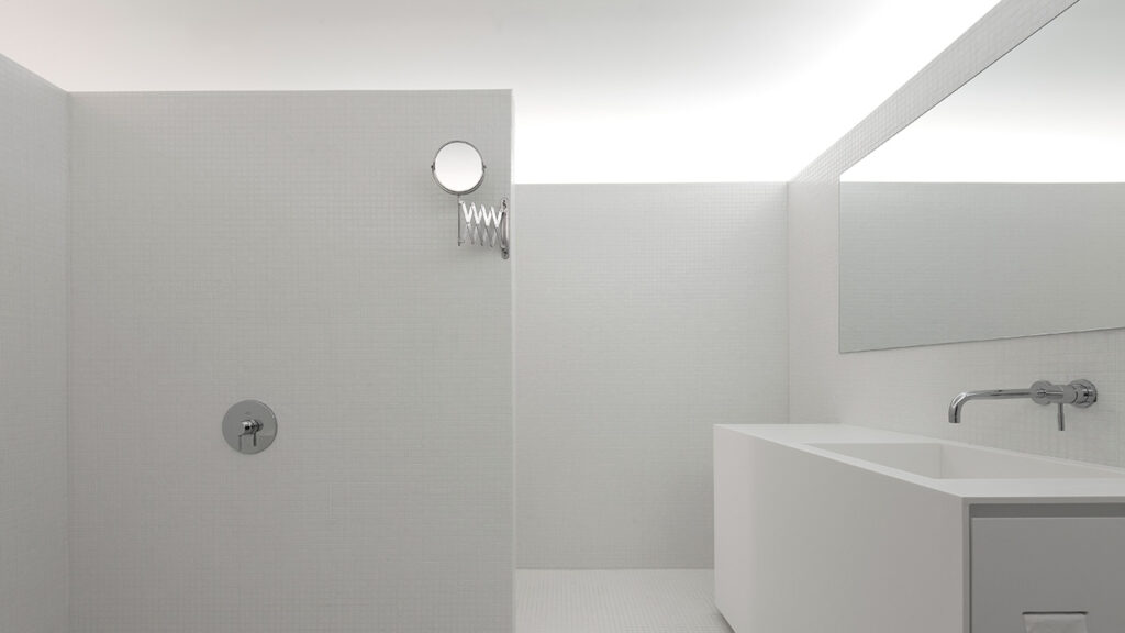 L’escalier et la coursive menant vers la suite privée de la propriétaire, située au niveau supérieur, se glisse à l’arrière de ce volume central, tout en offrant une vue magnifique vers les paliers inférieurs. À l’intérieur du cube se camoufle une salle de bain minimaliste et épurée, sans porte, où seule la configuration des cloisons préserve l’intimité. L’espace entre le haut des murs et le plafond baigne la pièce d’une lumière diffuse et crée une atmosphère apaisante empreinte de calme, évoluant selon l’heure du jour. De l’intérieur, plancher et cloisons sont entièrement recouverts d’une mosaïque de pâte de verre blanc perle. D’un blanc immaculé, la pièce est simplement meublée de deux blocs minimalistes : le bain et le meuble lavabo. Afin d’accentuer l’aspect monolithique du meuble, les portes et tiroirs au fini lisse et mat ont été disposés de part et d’autre de manière à éviter les divisions à l’avant, tandis qu’au dessus, le lavabo en Corian est moulé à même le comptoir. Un mince coup de pied détache le meuble du sol et procure à la salle de bain une impression d’espace et de légèreté.