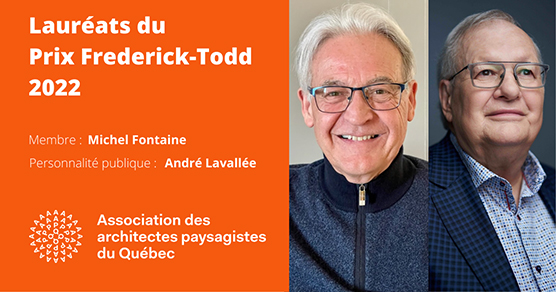 « Montréal, 6 avril 2022 – L’Association des architectes paysagistes du Québec (AAPQ) est heureuse d’annoncer les récipiendaires du prix Frederick-Todd pour l’année 2022 : M. Michel Fontaine et M. André Lavallée. Ce prix, décliné dans les catégories Membre et Personnalité publique, rend hommage à Frederick Todd, pionnier de la profession au Canada et premier architecte paysagiste résidant et œuvrant au Québec.