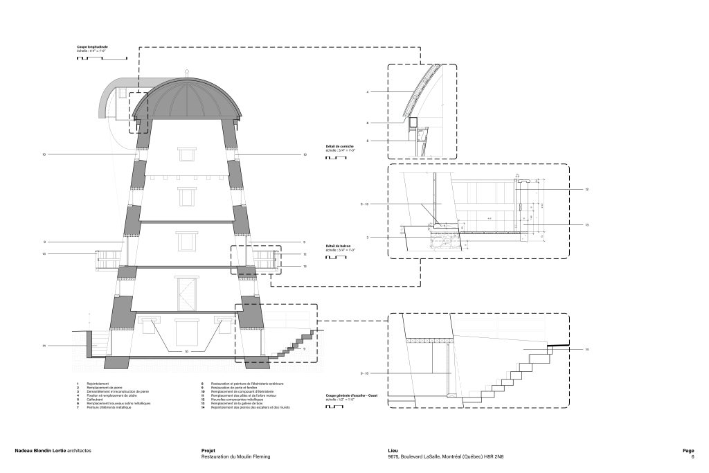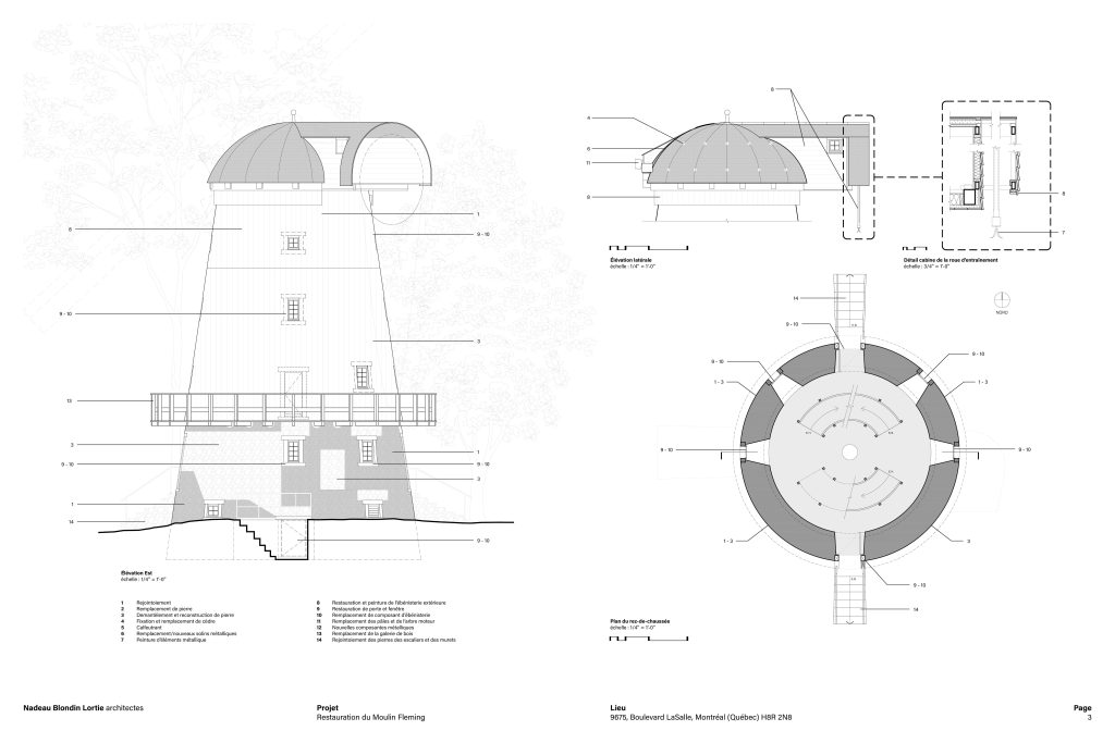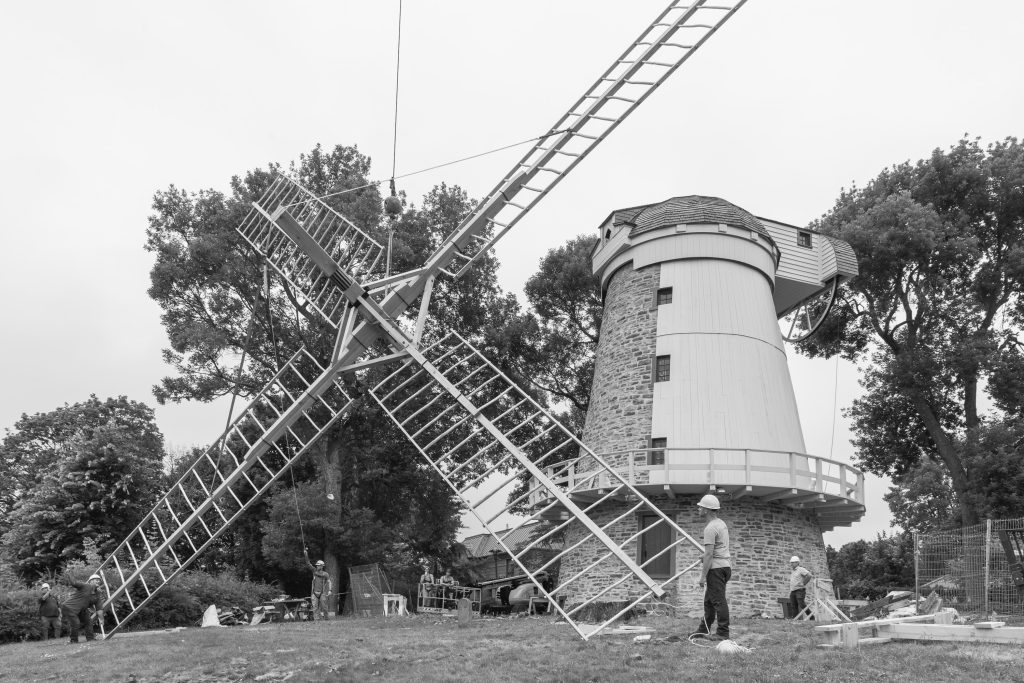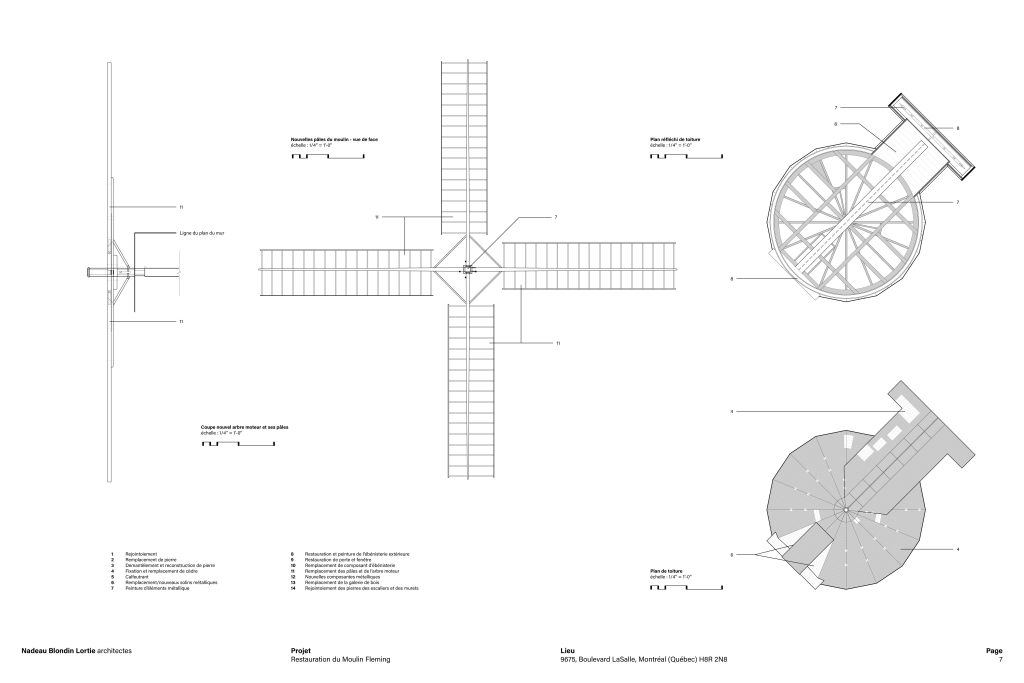 C’est exactement ce que la firme Nadeau Blondin Lortie a réussi, de manière tout à fait remarquable, dans le cas du moulin Fleming. Grâce à une approche de restauration méticuleuse, tant sur le plan de la maçonnerie que des pales (voir photo ci-bas montrant les pales séparées du moulin), ce projet hors du commun pour une firme d’architecture révèle une collaboration exemplaire entre l’ensemble des parties prenantes, au bénéfice ultime des citoyennes et citoyens de LaSalle. Il rappelle aussi l’importance d’assurer une relève au sein des différents corps de métier, qui portent des savoir-faire spécialisés en voie de disparition.