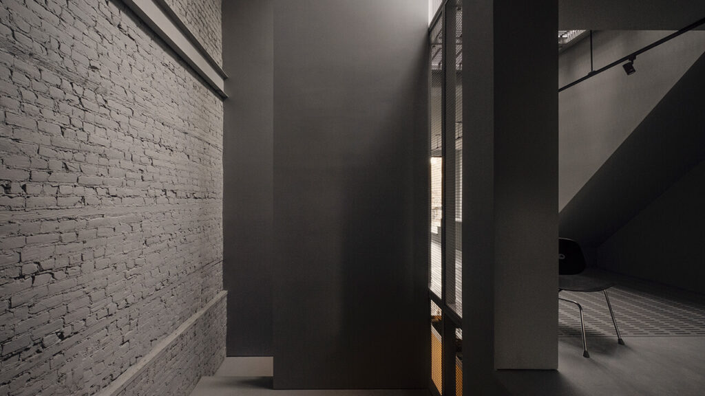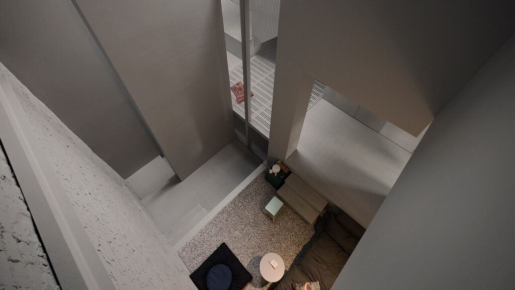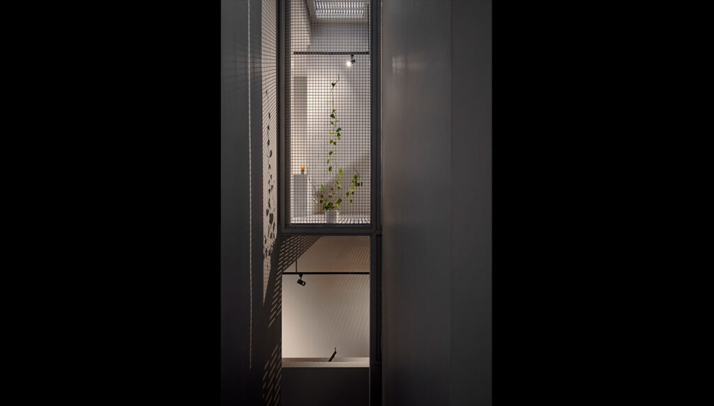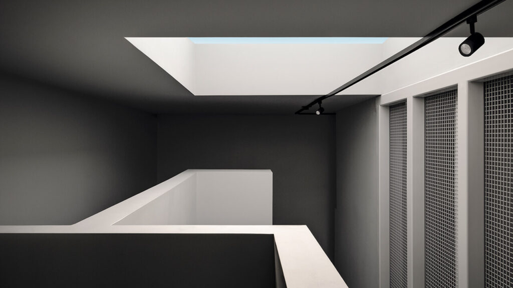 S’accordant aux exigences d’adaptabilité fonctionnelle tout en minimisant le besoin de mobilier, le nouveau système d’organisation spatiale engage d’inhabituelles interactions afin de faciliter une appropriation personnelle et créative des sous-espaces qu’il façonne. Fragmentées par les écrans métalliques et les murets, et rythmées par les déambulations, les pauses scéniques proposent de nouveaux points de vue sur l’espace et de nouvelles perspectives sur la présence de l’autre. L’imposant assemblage métallique, qui consolide également l’intégrité structurale, se coiffe d’un puits de lumière de 2,5 mètres par 2,5 mètres afin de maximiser l’apport de luminosité naturelle en la diffusant jusqu’au rez-de-chaussée.