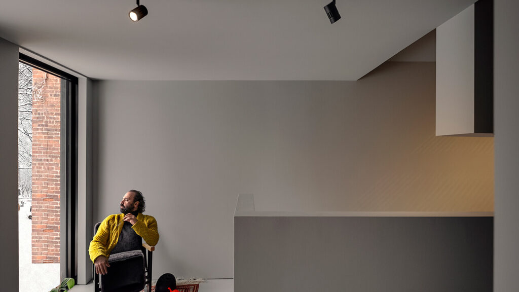 La palette de couleurs peut sembler sévère, mais tel un musée, elle permet à ses usagers et au mobilier de se démarquer dans l’espace, d’être des « acteurs » dans le décor. Le traitement vertical des relations visuelles entre les pièces de vie déconcerte de façon pleinement assumée, pleinement célébrée.