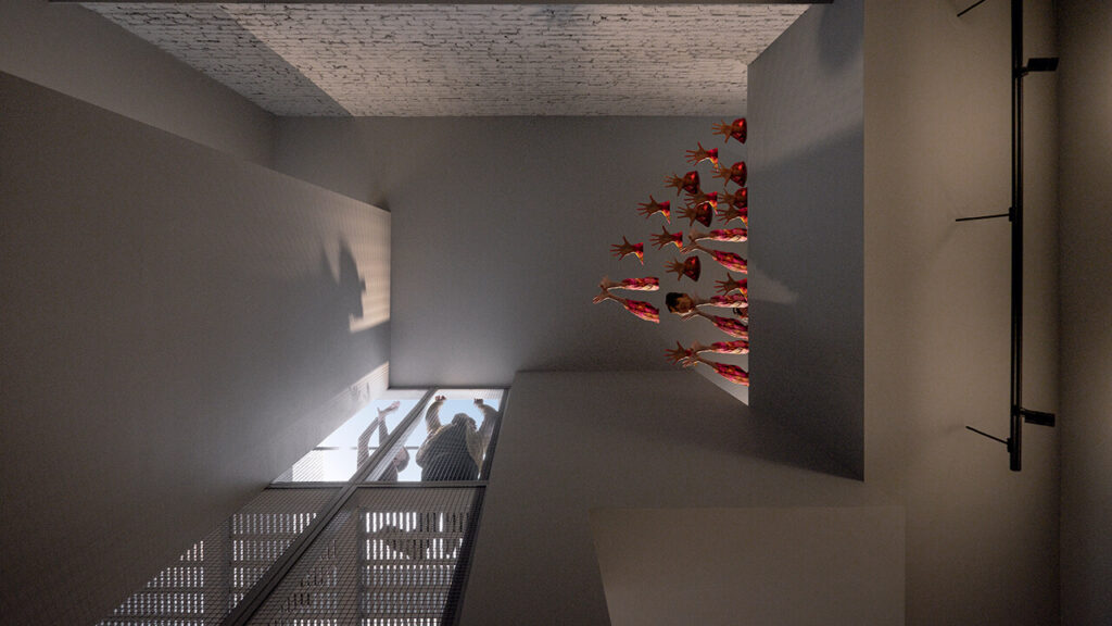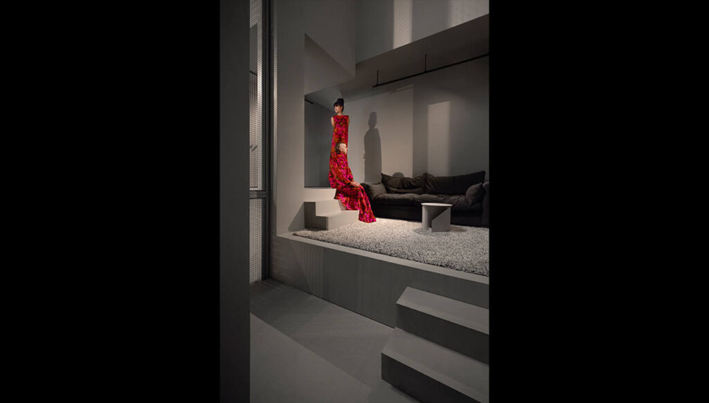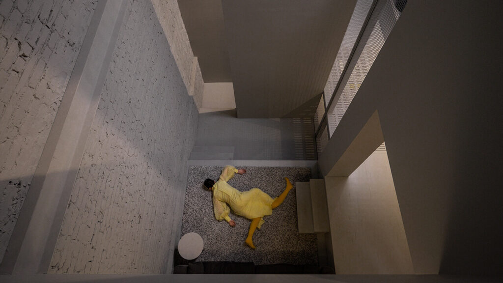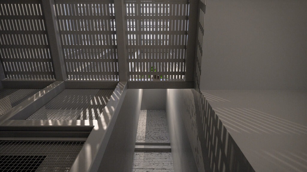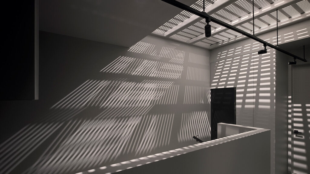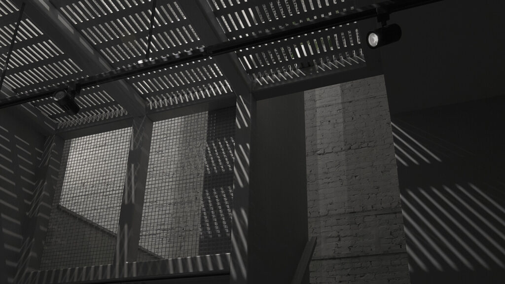 La lumière, filtrée par les surfaces et les parois métalliques, multiplie les projections d’ombres portées pour marquer l’espace de tracés graphiques opposant leur présence aux délimitations spatiales, et offrant une continuelle danse d’ombrages géométriques qui s’amusent sur le canevas monochrome. À la fois dépouillée et expressive, la proposition constitue un assemblage morcelant la volumétrie et la lumière pour envelopper le lieu d’une aura mystérieuse contribuant à la théâtralité de l’expérimentation qu’elle propose.
