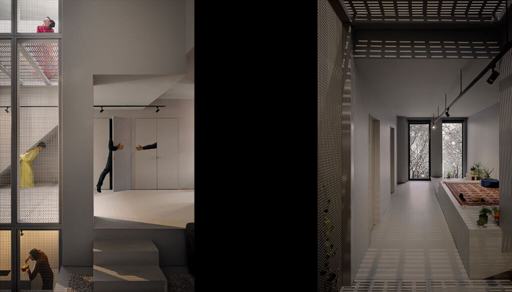 La proposition visant une cohabitation efficace des activités domestiques et professionnelles, une perméabilité à la vie familiale et une répartition spatiale procurant également un niveau d’intimité individuelle, tire parti d’un décloisonnement pour consolider le sentiment d’unification dans le déploiement vertical et pour métamorphoser la lisibilité de l’ensemble.