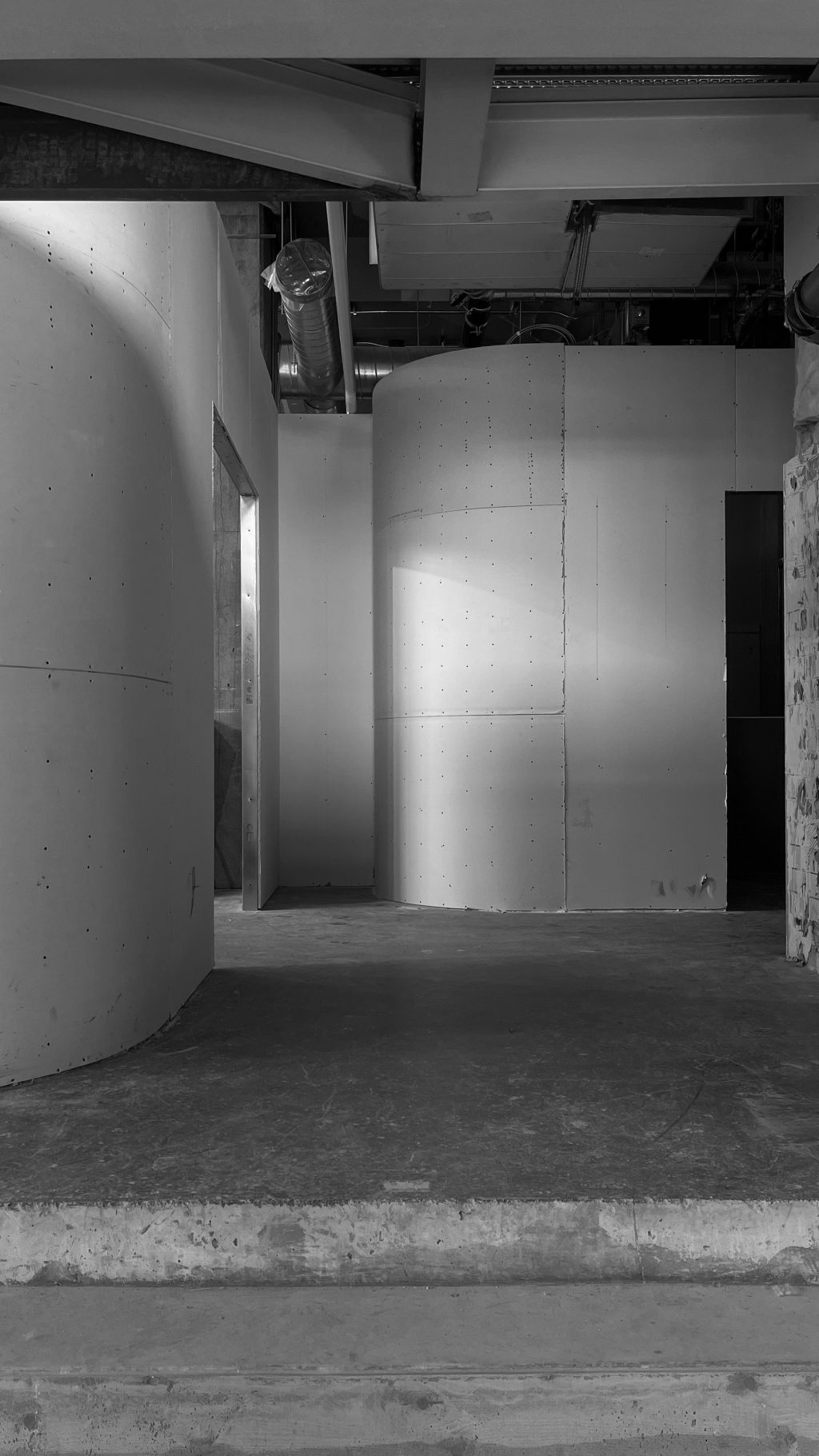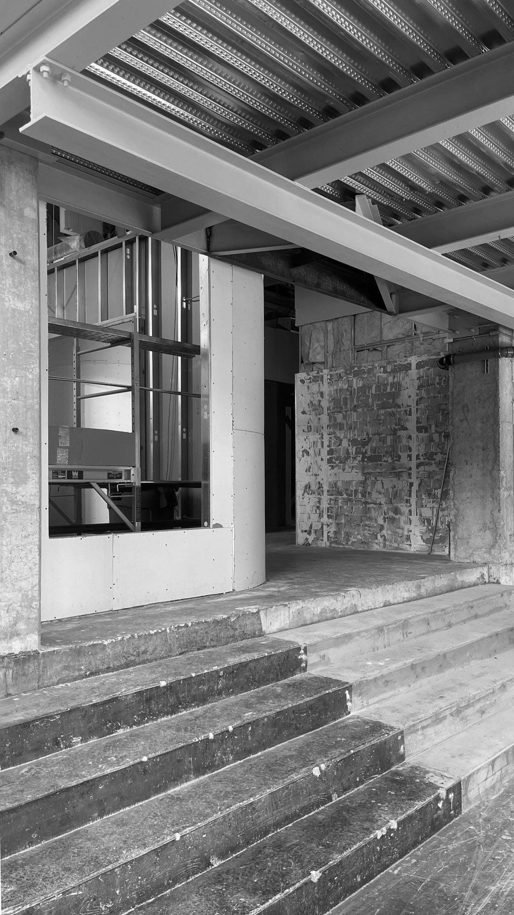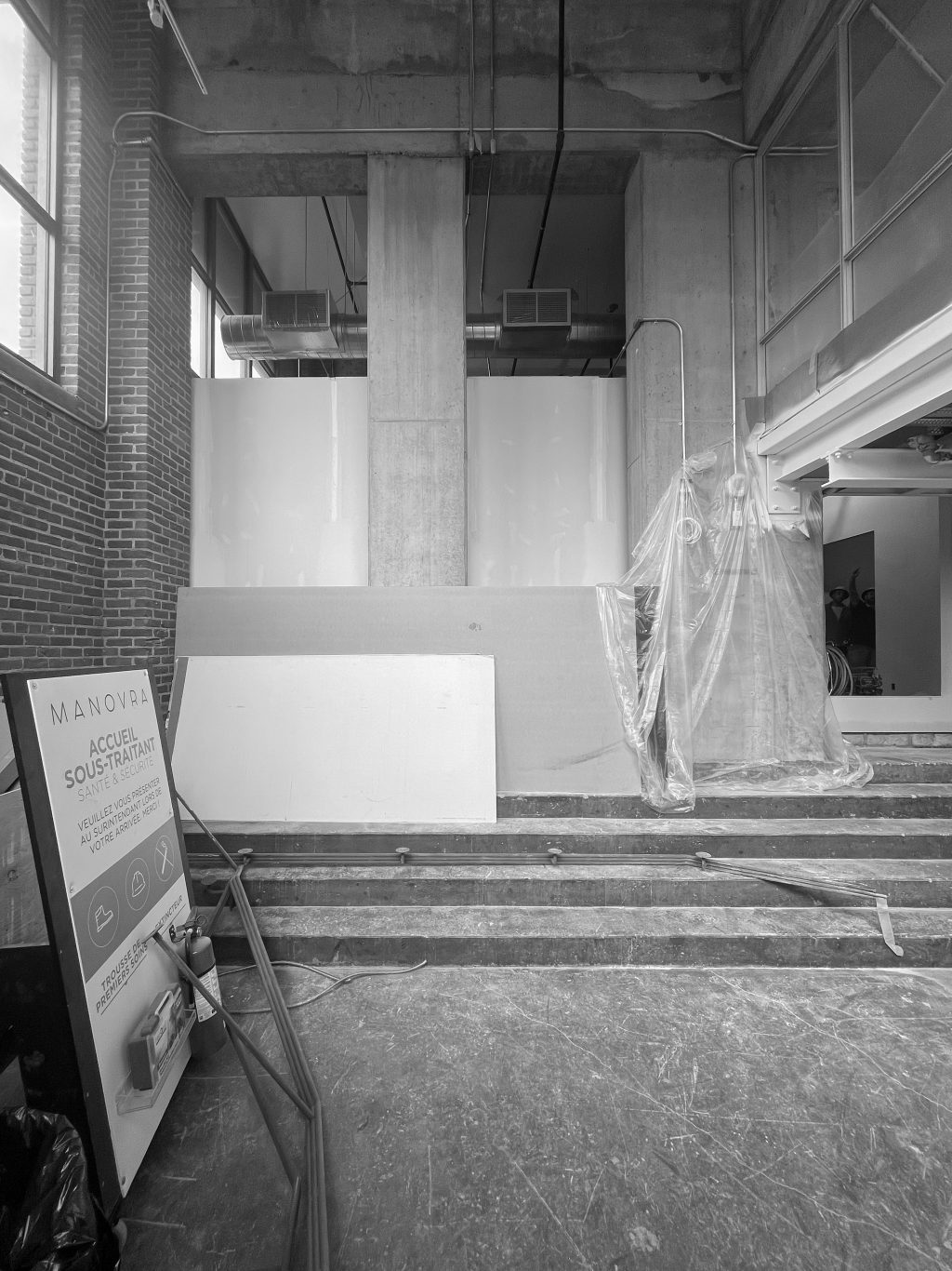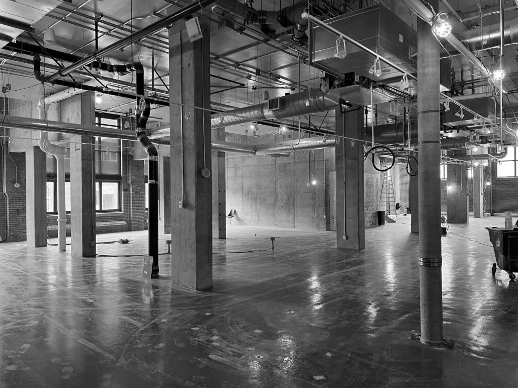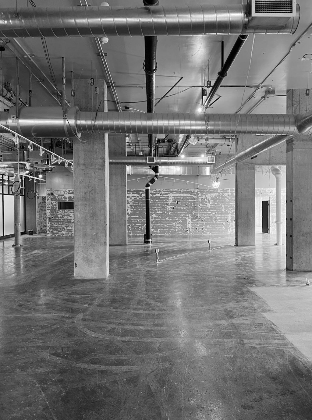 Une seconde entrée, située à l’arrière, relie Muni au bâtiment Nordelec, facilitant l’accès depuis le complexe. Un escalier derrière la réception mène à une mezzanine surplombant la salle principale, réservée aux événements privés.