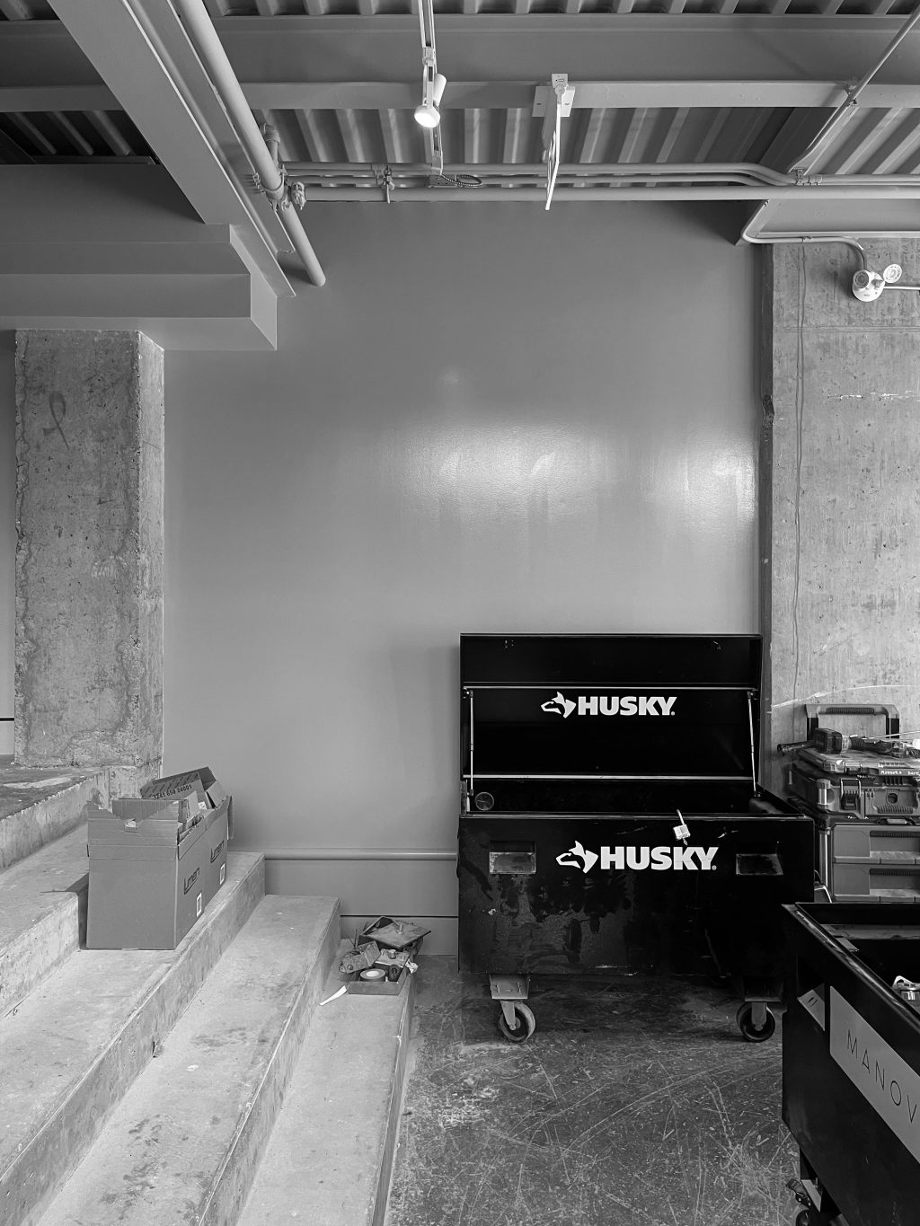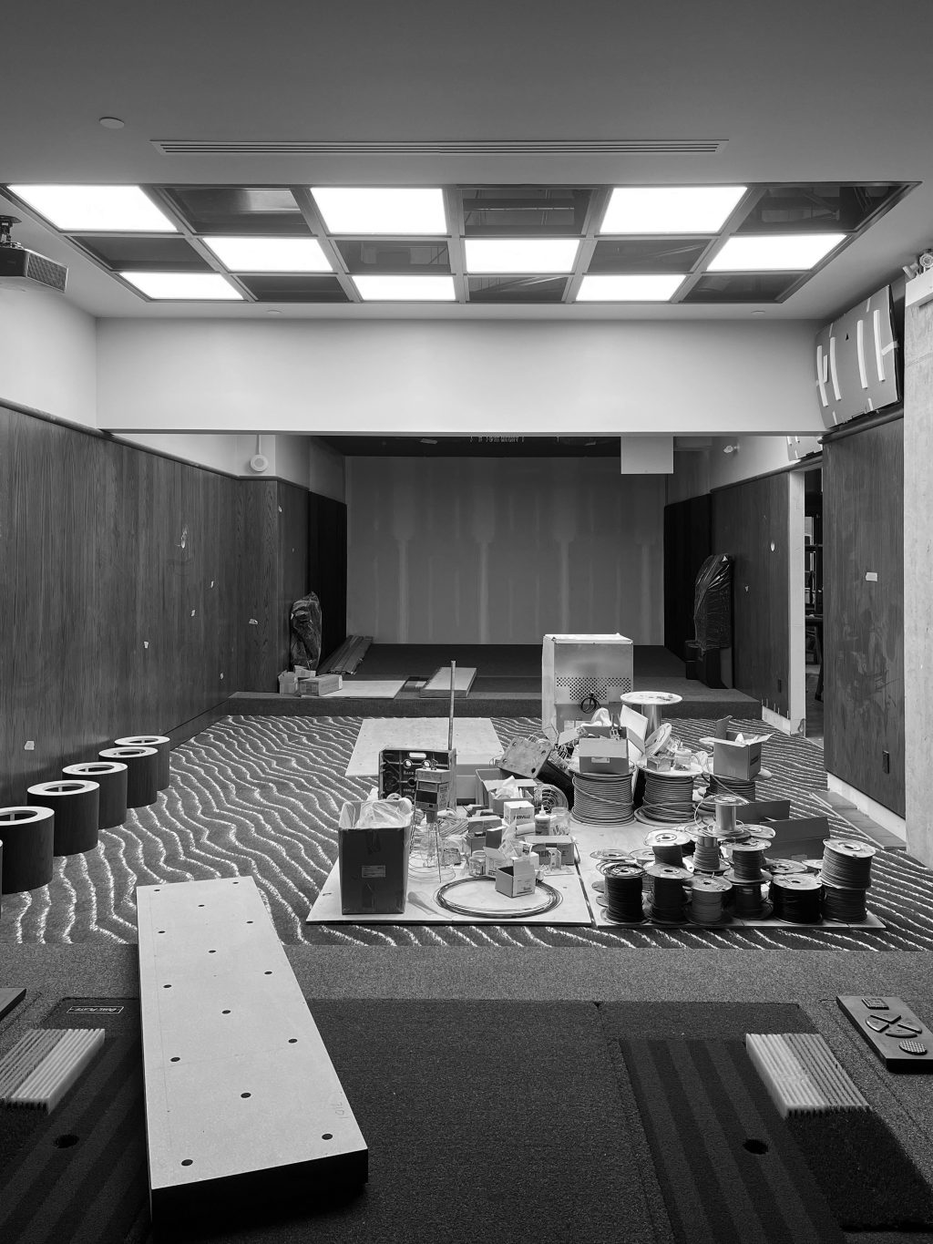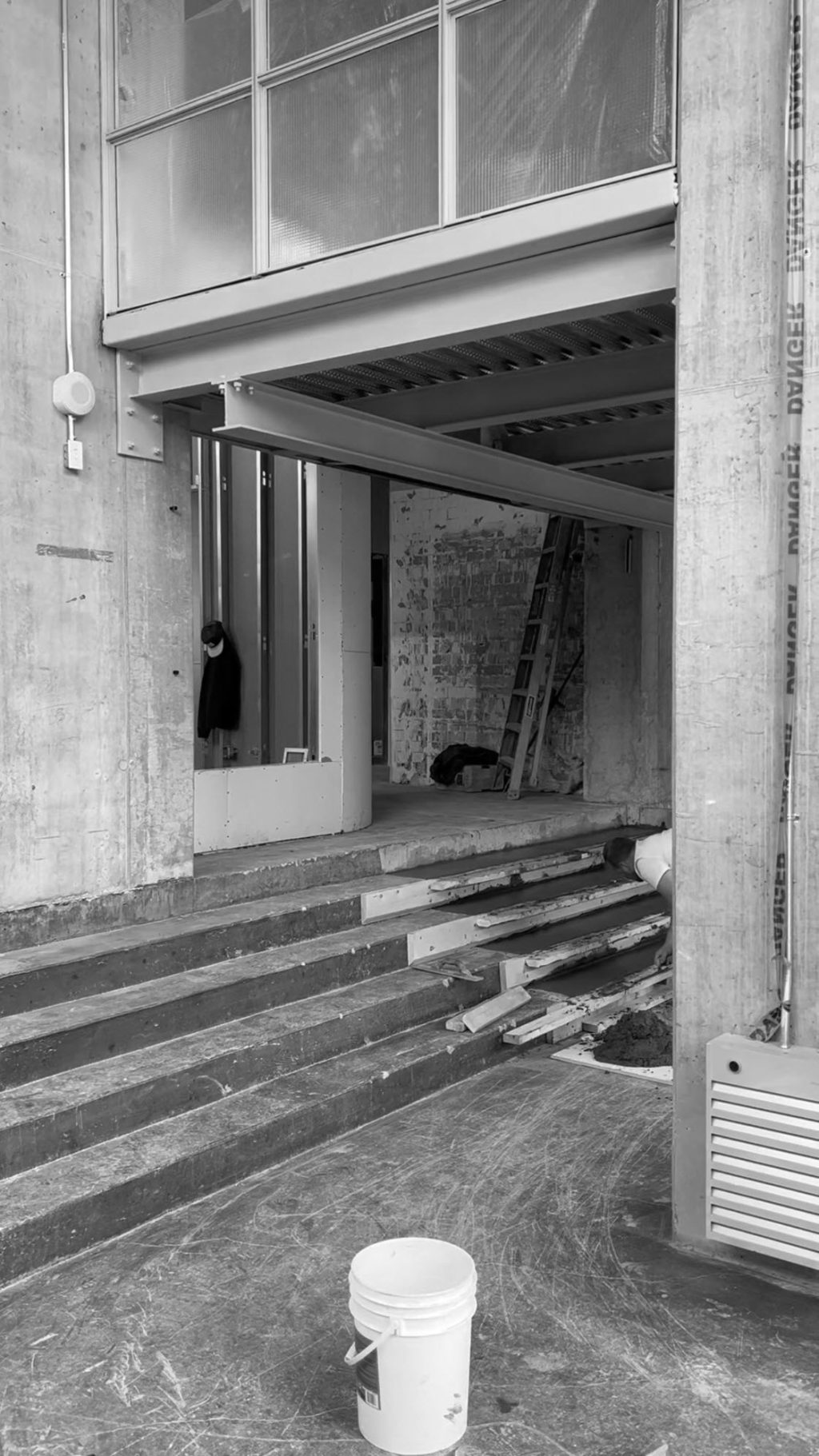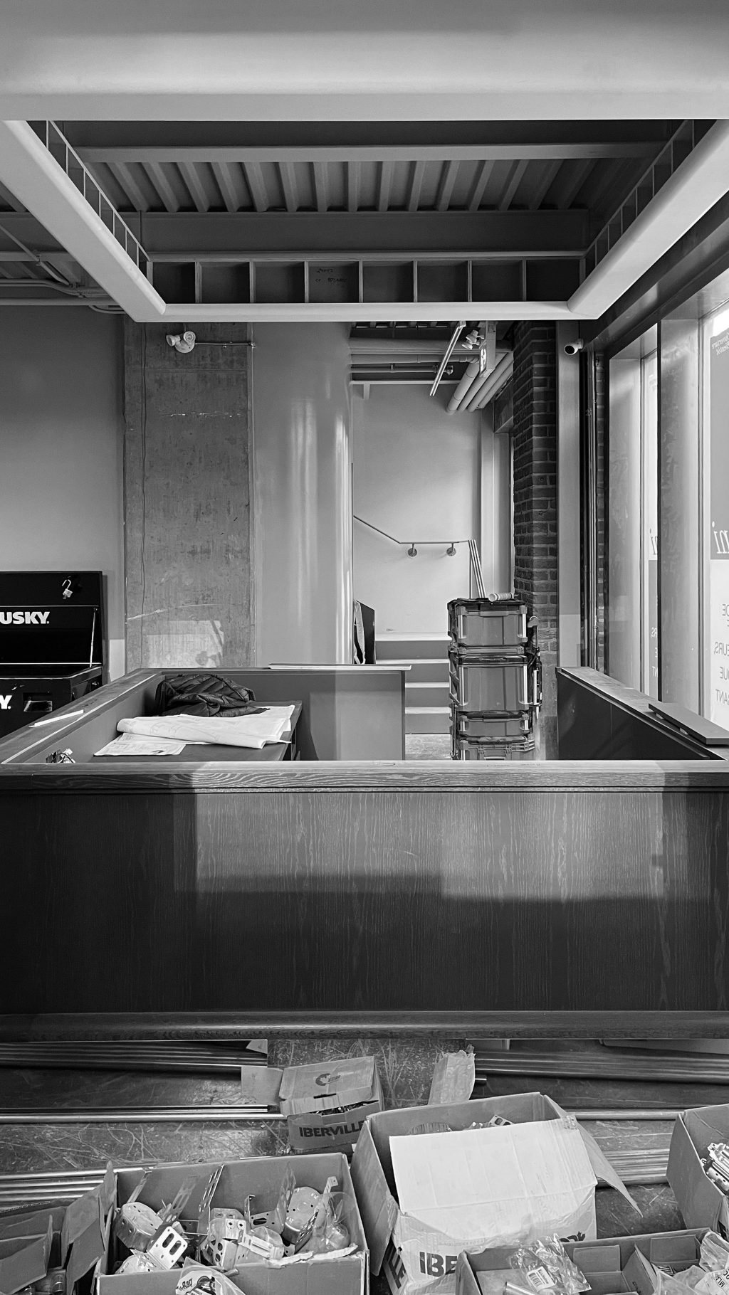 Une seconde entrée, située à l’arrière, relie Muni au bâtiment Nordelec, facilitant l’accès depuis le complexe. Un escalier derrière la réception mène à une mezzanine surplombant la salle principale, réservée aux événements privés.