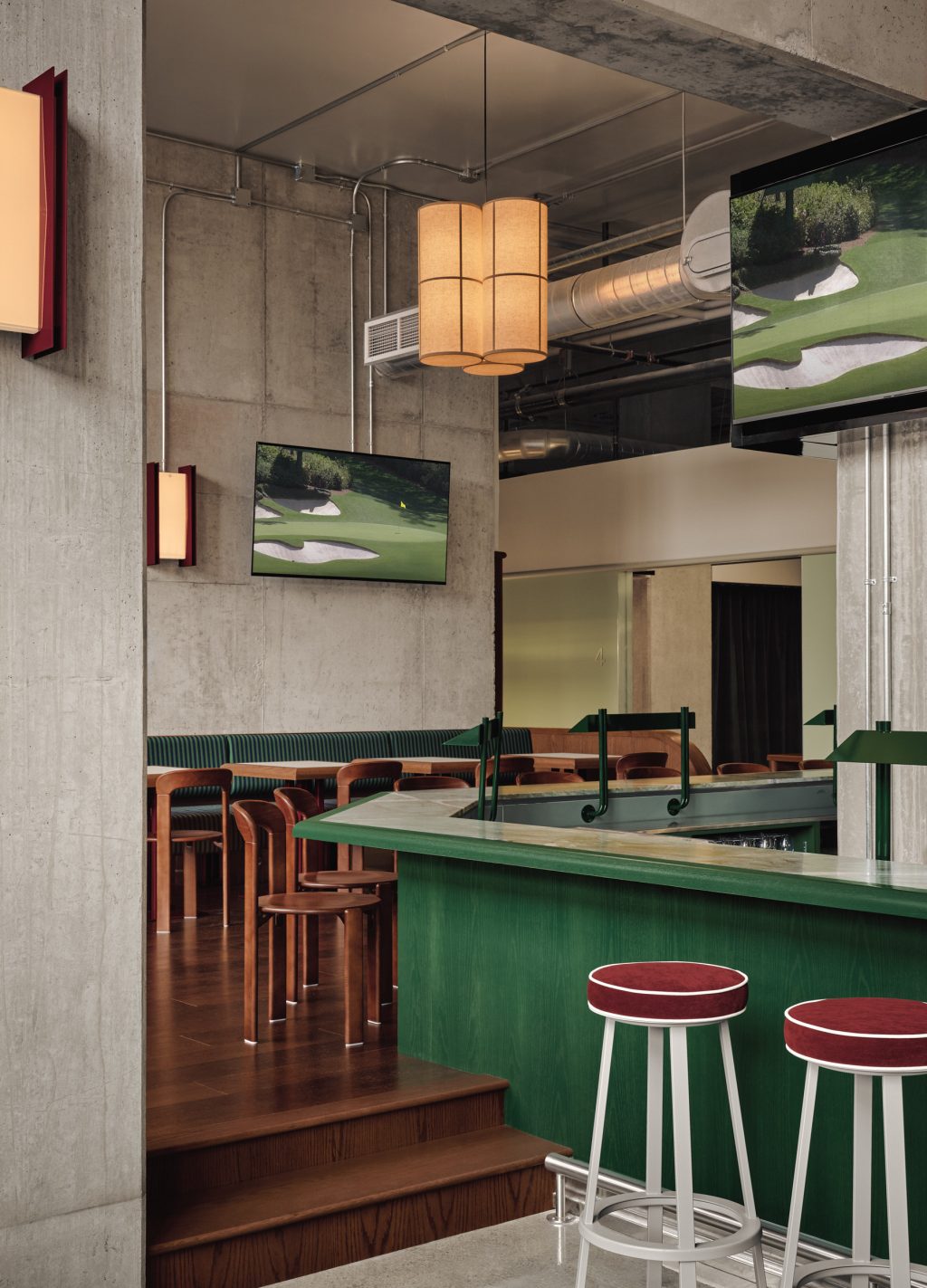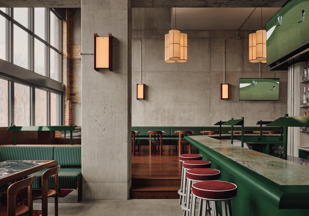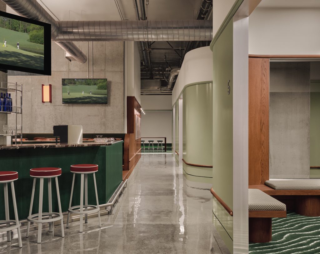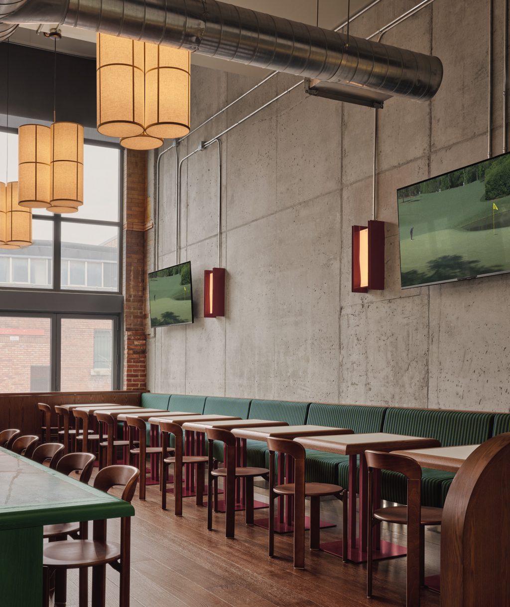 Dans les salons de simulateurs, les murs en bois, la moquette texturée verte à motif ondulé – évoquant l’herbe – et les lourds rideaux vert foncé créent une atmosphère feutrée et immersive. L’espace intègre également des clins d’oeil ludiques aux textures du golf : plafonds en damier rétroéclairés, tissus rayés sur les banquettes, touches de rouge profond sur les bases du mobilier.