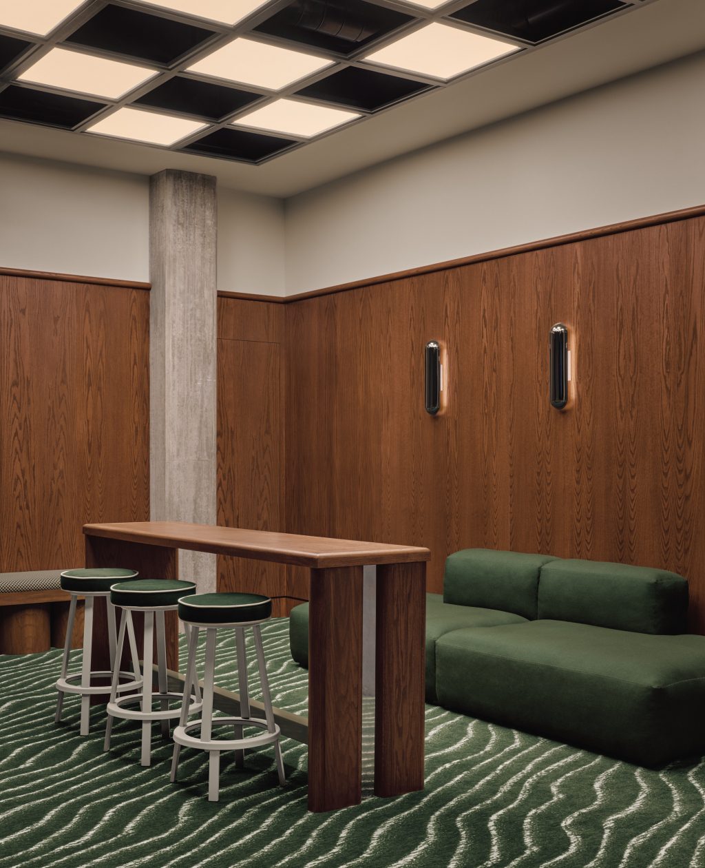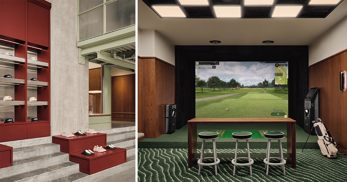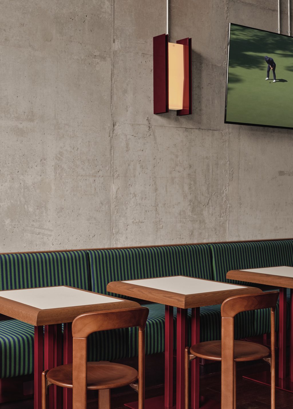 Dans les salons de simulateurs, les murs en bois, la moquette texturée verte à motif ondulé – évoquant l’herbe – et les lourds rideaux vert foncé créent une atmosphère feutrée et immersive. L’espace intègre également des clins d’oeil ludiques aux textures du golf : plafonds en damier rétroéclairés, tissus rayés sur les banquettes, touches de rouge profond sur les bases du mobilier.