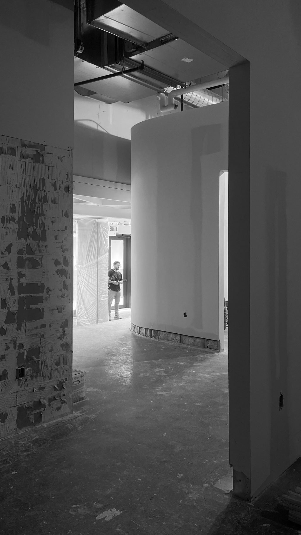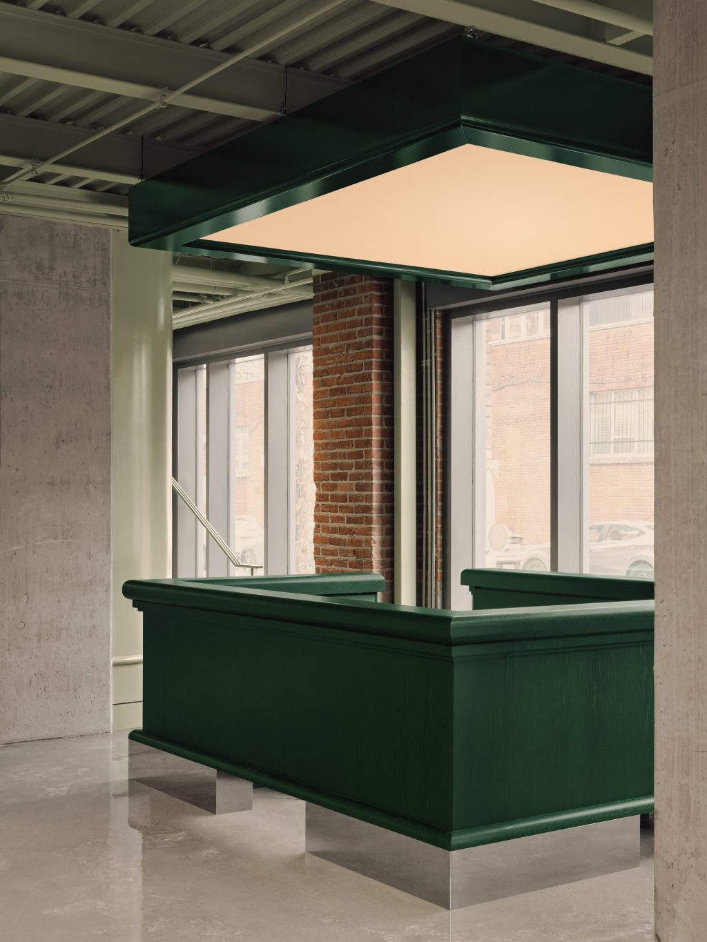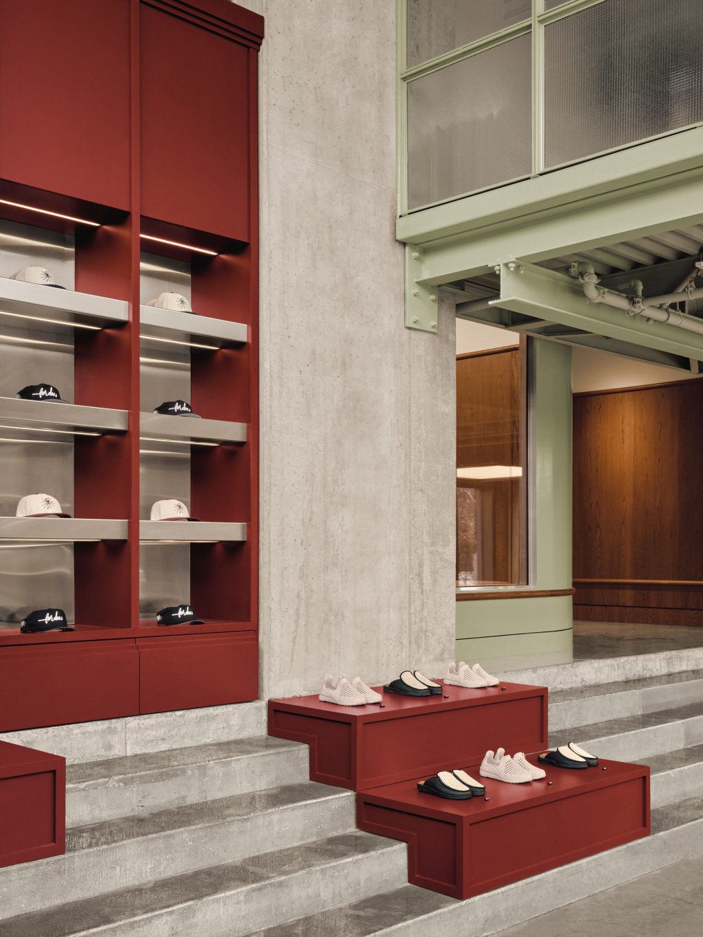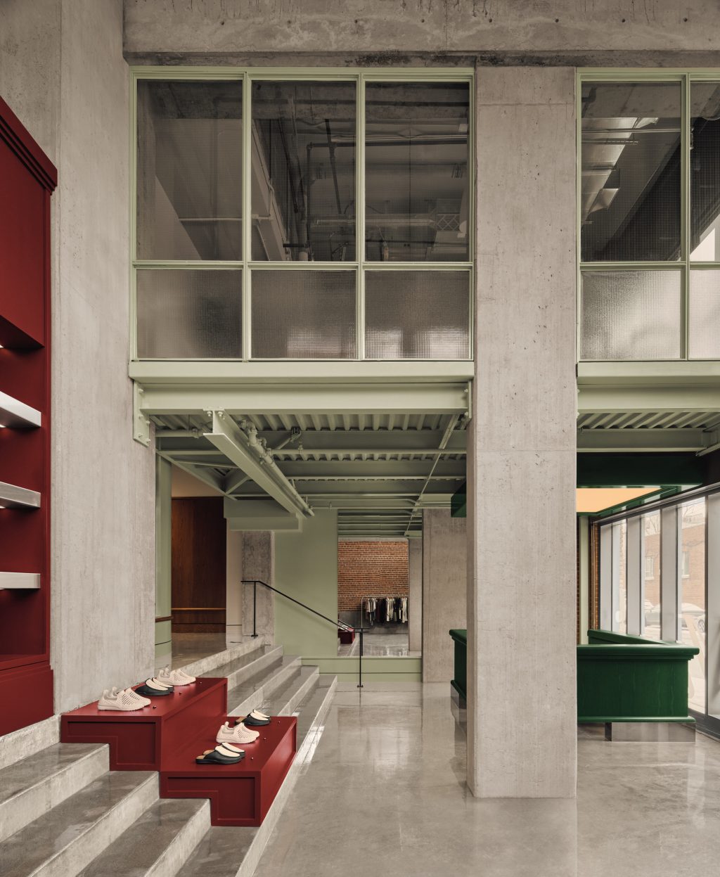 Occupant 645 m² (6 943 pi²), Muni s’étend sur un local d’angle au rez-de-chaussée avec une entrée privée. Le parcours débute dans un espace d’accueil en double hauteur, où une boutique propose vêtements et équipements de golf. Un comptoir de réception en chêne teint vert structure l’espace, tandis qu’un long escalier en béton mène à l’aire principale du club. Intégré dans cet escalier, des étagères sur mesure intègre les marches comme accès aux étagères tout en servant de blocs de présentation pour la marchandise.