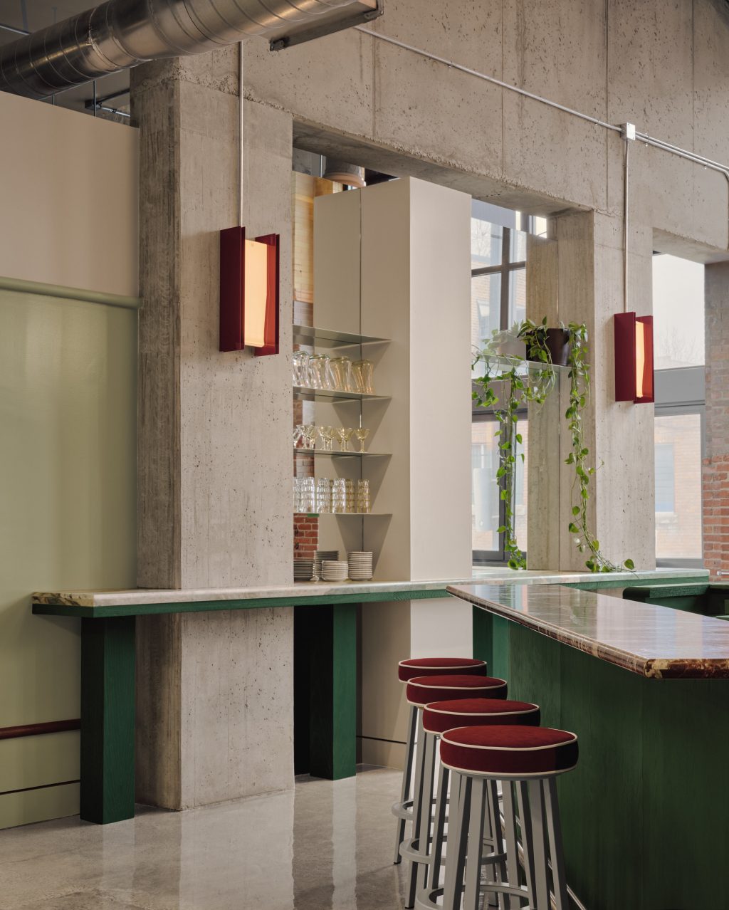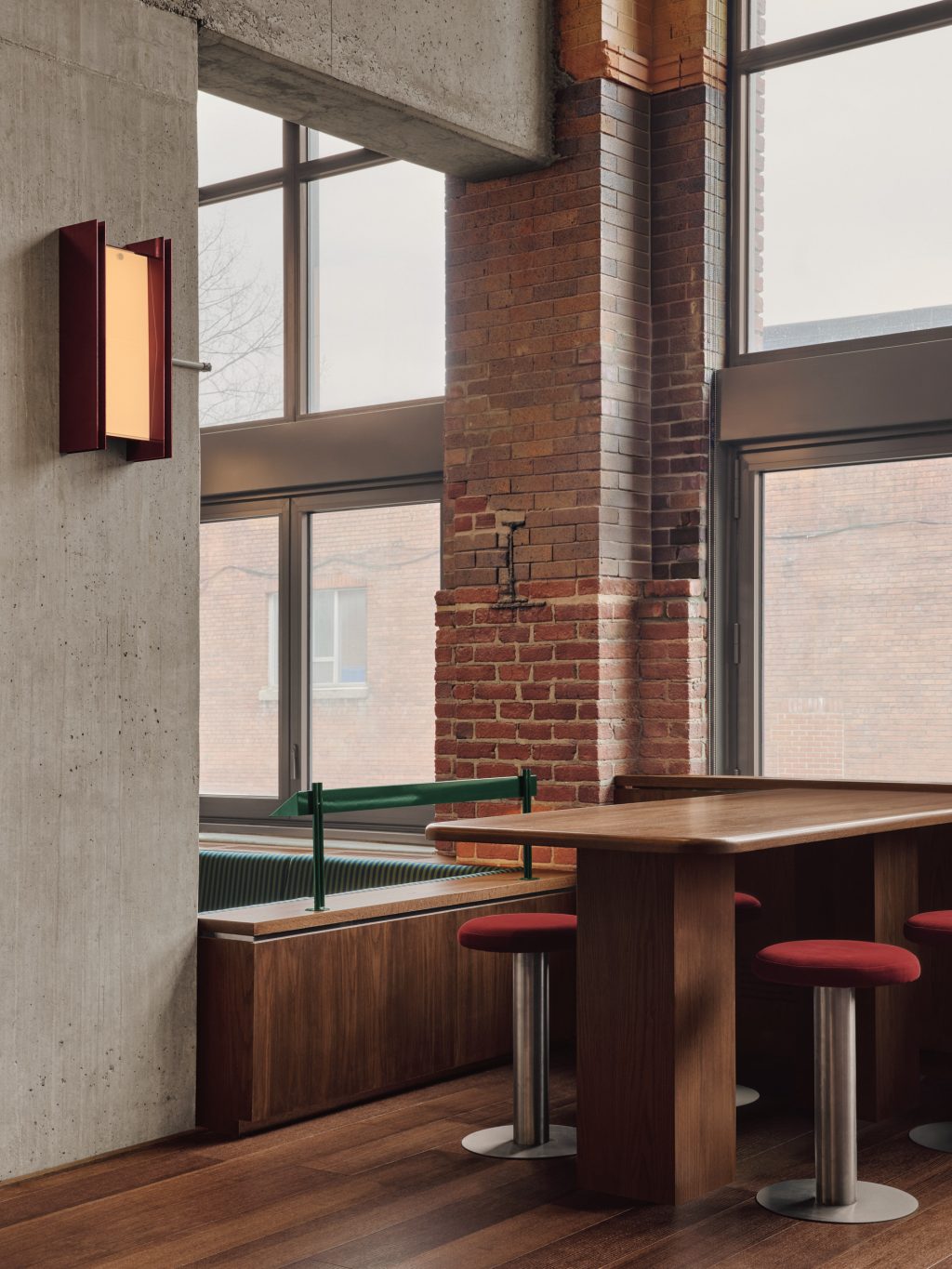 L’esthétique de Muni marie les codes des clubs de golf classiques à une approche contemporaine. La palette de couleurs, oscillant entre verts profonds, tons inspirés des green de golf et accents bordeaux, instaure une ambiance à la fois raffinée et vibrante. Le chêne rouge naturel recouvre certains murs et éléments d’ébénisterie, apportant une chaleur contrastant avec la brutalité du béton et de la brique.