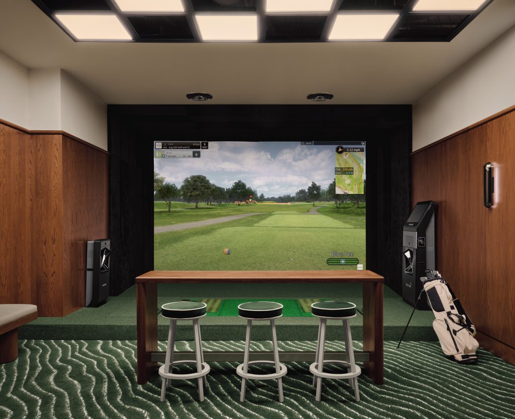 Un couloir central organise l’espace en zones distinctes mais interconnectées. D’un côté, sept salons privés de simulateurs de golf sont disposés en paires, avec un dernier salon accueillant trois simulateurs. Chaque espace est conçu comme un salon semi-privé, offrant une table haute avec tabourets, des banquettes confortables et des zones encastrées propices aux échanges. Un plafond rétroéclairé à motif damier ajoute une touche distinctive et chaleureuse.