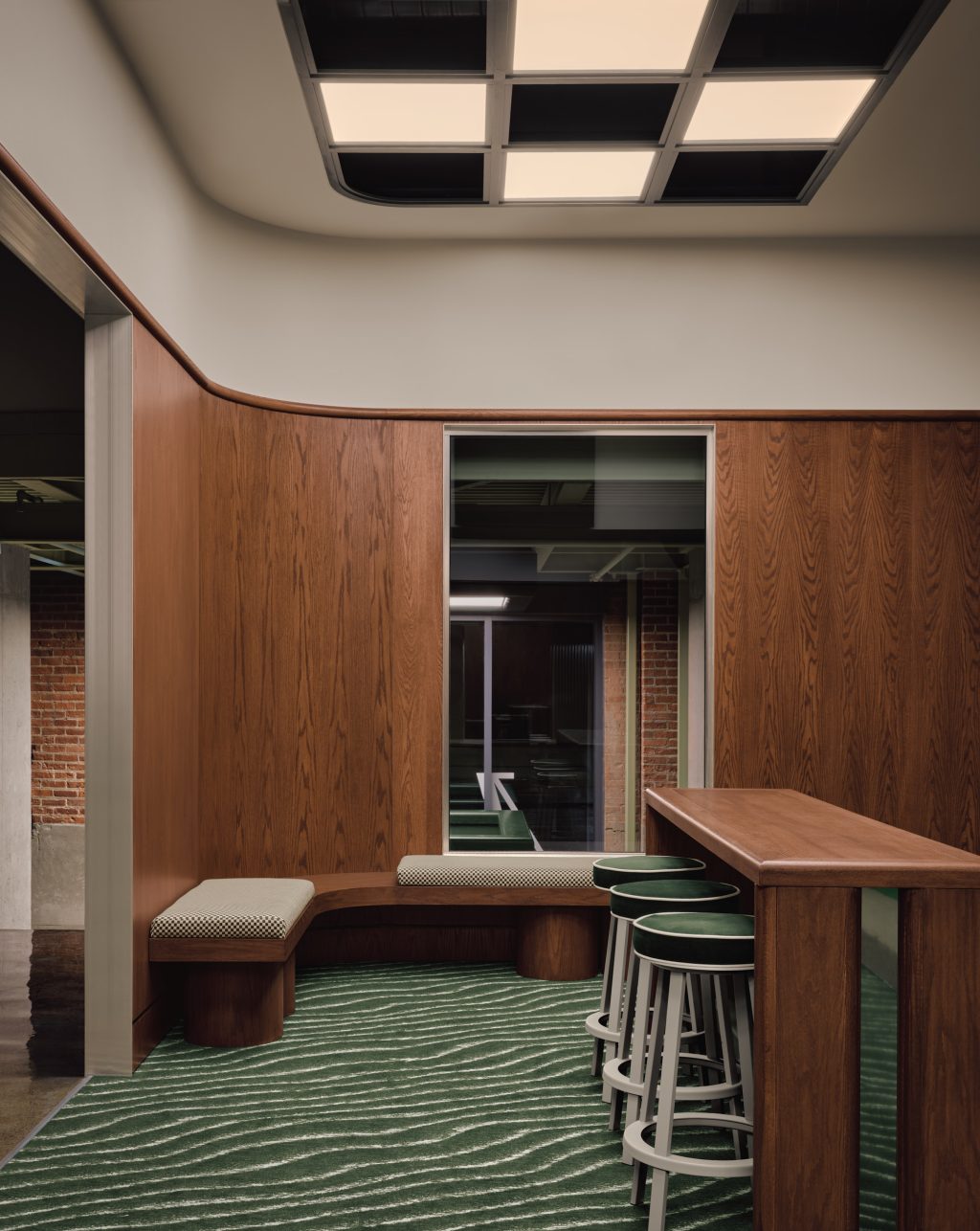 Chaque élément de l’aménagement a été pensé et dessiné de manière à réinterpréter les codes du golf dans un langage contemporain. Marbre vert et chêne rouge côtoient la brique et le béton du bâtiment existant pour créer une ambiance singulière. Plusieurs éléments audacieux et habilement maîtrisés – comme le tapis texturé ou le plafond en damier – viennent enrichir l’ensemble.