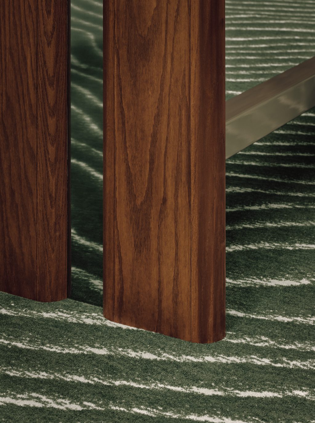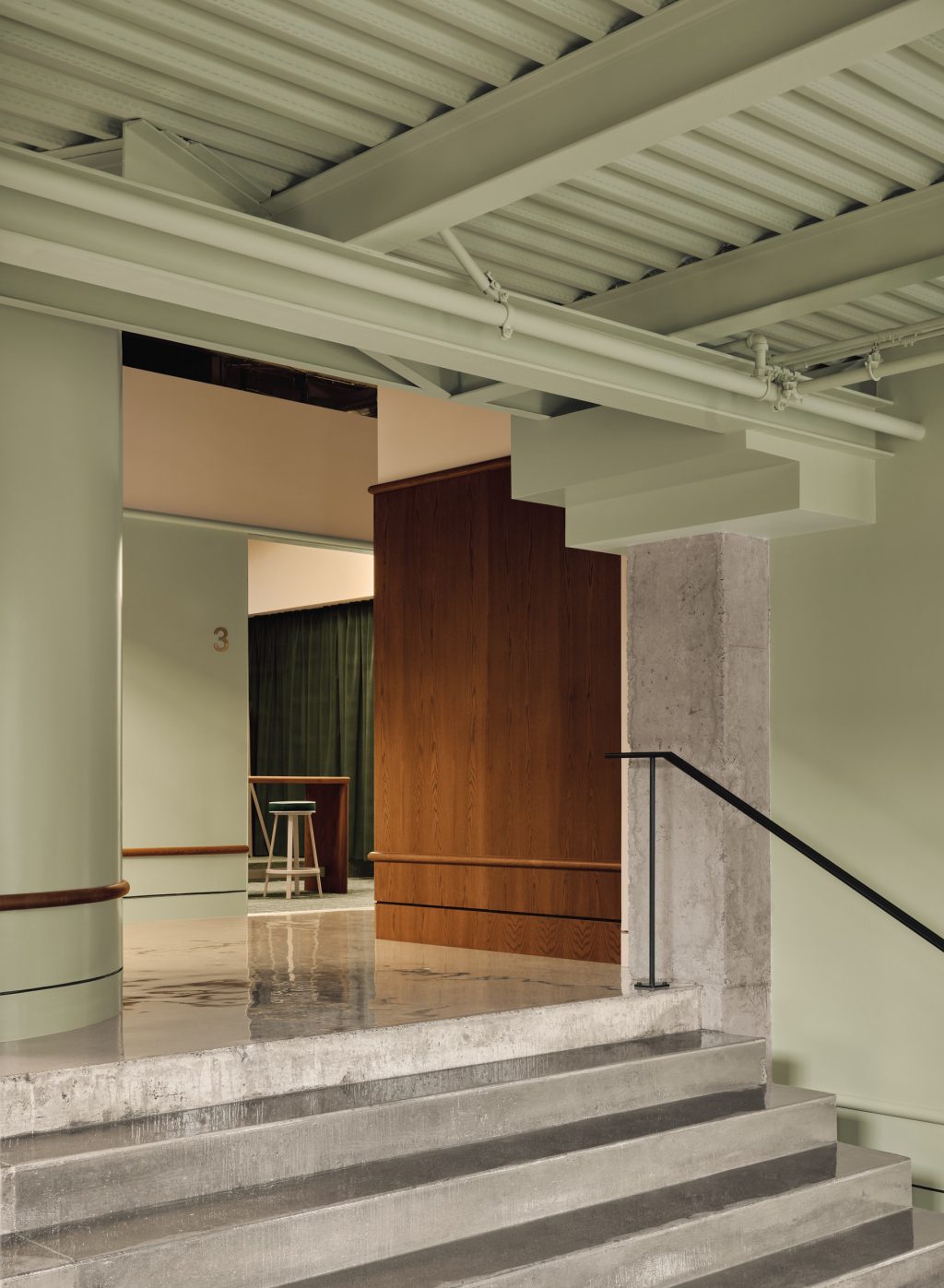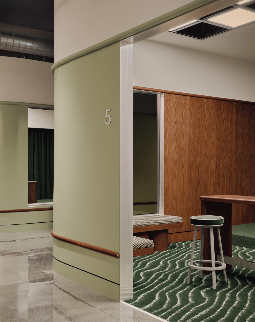La palette matériau intègre aussi du chêne teint vert, du marbre vert et rouge, ainsi que des murs peints en vert menthe brillant. Ces matières chaleureuses contrastent avec des détails en acier inoxydable et chrome, rappelle l’aspect technologique des simulateurs.