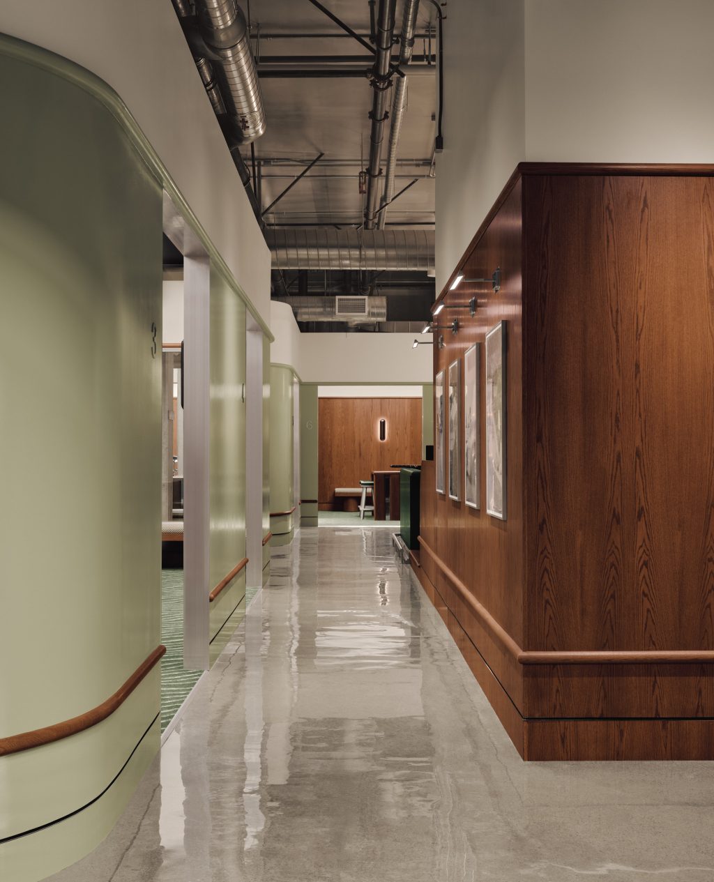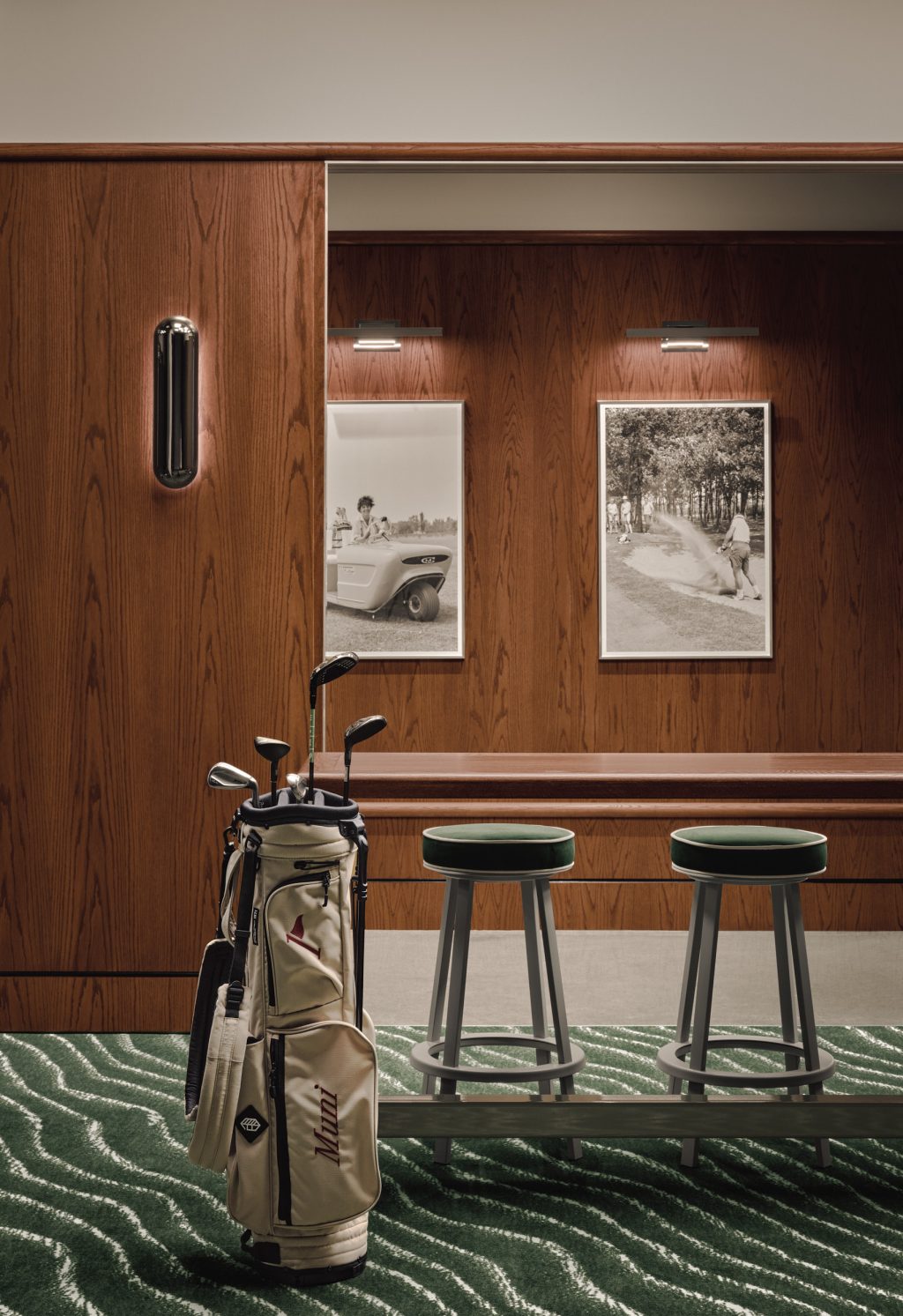 Pour une ambiance plus intime, des luminaires triangulaires inspirés des drapeaux de golf sont posés sur le bar. Dans les salons de simulateurs, des plafonds lumineux en damier diffusent un éclairage doux au-dessus des tables et tabourets, évoquant les motifs iconiques du sport. Des appliques minimalistes en chrome complètent l’ambiance feutrée des salons, tandis qu’une galerie murale où les oeuvres sont mises en valeur par des luminaires décoratifs dans le couloir rappelle l’esprit des « halls of fame » des clubs traditionnels.