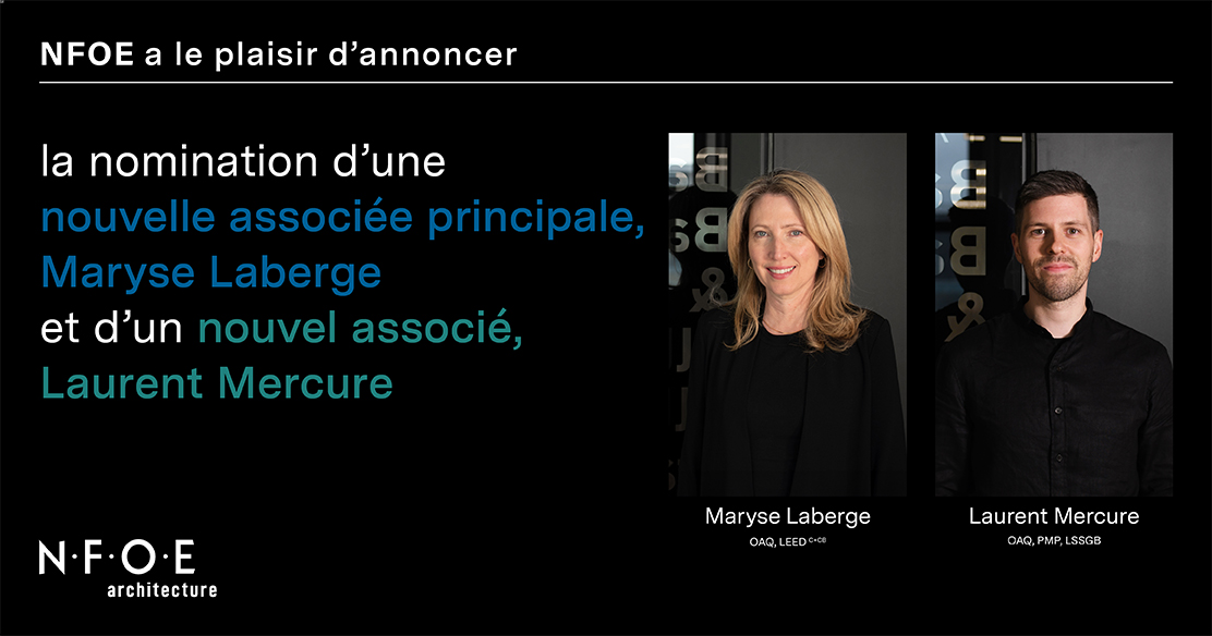 « Montréal, le 1er juin 2024 – NFOE est fière d’annoncer la nomination de Maryse Laberge à titre d’associée principale et de Laurent Mercure à titre d’associé. Ces nominations viennent renforcer notre engagement envers la qualité, l’innovation, la durabilité, la collaboration et le plaisir au travail. Maryse et Laurent incarnent parfaitement ces principes tout en contribuant à la vision de l’avenir de l’entreprise qui souhaite continuer à réaliser des projets spécialisés et novateurs en harmonisant expertise humaine et technologies de pointe.