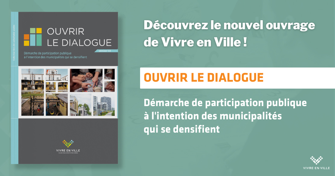 « Montréal, le 11 janvier 2024 – Les transformations urbaines, notamment la densification, sont essentielles aux transitions climatiques, sociales et écologiques de nos collectivités. Toutefois, cette évolution des milieux de vie soulève des préoccupations citoyennes. Face à la conciliation parfois délicate de ces divers impératifs, Vivre en Ville lance aujourd’hui son nouvel ouvrage, Ouvrir le dialogue : démarche de participation publique à l’intention des municipalités qui se densifient. En posant les bases d’une approche urbanistique participative et des conditions d’un dialogue constructif, cet ouvrage offre un soutien aux municipalités pour relever le défi d’ouvrir ou de renforcer le dialogue sur la densification, pour convenir collectivement des modalités de transformation des milieux de vie existants, et, à terme, accélérer les transformations urbaines favorables au climat.