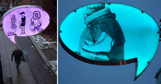 « L’hiver dernier, les bulles de BD lumineuses du projet Idée-O-Rama, conçu par les deux jeunes designers Estelle Jugant et Yazid Belkhir de Turn Me On Design, ont suscité un tel engouement que des médias et blogues internationaux aussi prestigieux que The Verge en ont parlé. Cette année, le projet revient avec de toutes nouvelles illustrations signées Mireille St-Pierre, qui se distingue par son approche poétique et raffinée, et Michel Hellman, bédéiste reconnu pour son humour tendre et décalé. Fixés aux lampadaires de l’avenue du Mont-Royal, une centaine de phylactères lumineux (vingt de plus que l’an dernier, recto verso) illustrent l’hiver et notre nordicité de manière humoristique et festive. La multitude de bulles installées le long de l’artère trace un parcours lumineux original et harmonieux. Pouvant être appréciées en journée, les bulles de BD prennent toute leur ampleur à la tombée de la nuit, avec un changement continu de couleurs. La mise en lumière hivernale du projet Idée-O-Rama a aussi été saluée par de nombreux passants comme une manière vraiment inventive et fantaisiste d’animer une grande artère en hiver… »