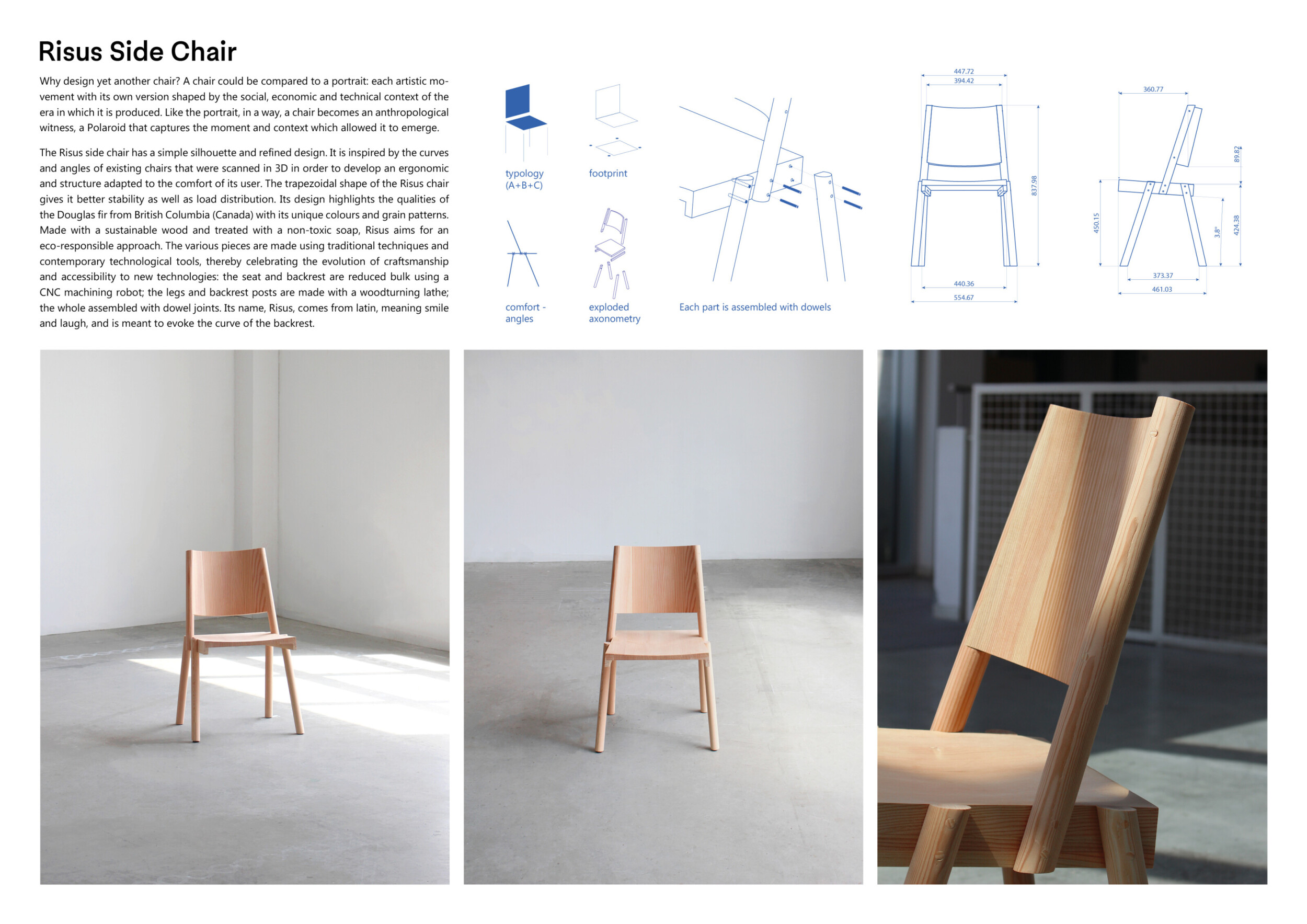 Les différentes pièces ont été réalisées à la fois à l’aide de techniques traditionnelles et d’outils technologiques contemporains, célébrant ainsi l’évolution de l’artisanat et de l’accessibilité aux nouvelles technologies. L’usinage à la CNC a permis les courbes du dossier et de l’assise, tandis que les pattes et les montants du dossier sont réalisés au tour à bois, le tout assemblé à l’aide de goujons. Son nom, Risus, vient du latin et signifie un sourire moqueur, évoquant la courbe du dossier de la chaise vue d’en haut.