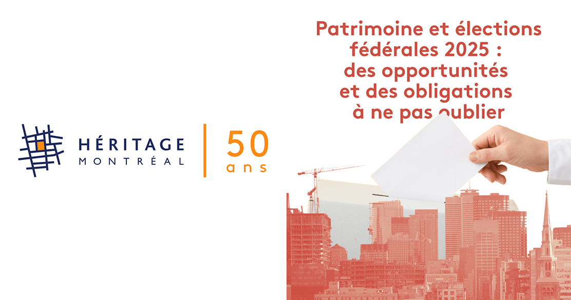 « À l’occasion des élections fédérales d’avril 2025, Héritage Montréal rappelle aux personnes candidates et aux formations politiques en lice que le futur gouvernement du Canada aura des responsabilités à assumer, des défis à relever et des opportunités à saisir en matière de patrimoine et d’aménagement qui touchent Montréal et sa région métropolitaine. Trop souvent, ce patrimoine et le cadre bâti sont évoqués par sympathie ou servent de décor aux annonces, sans proposition ni engagements concrets.