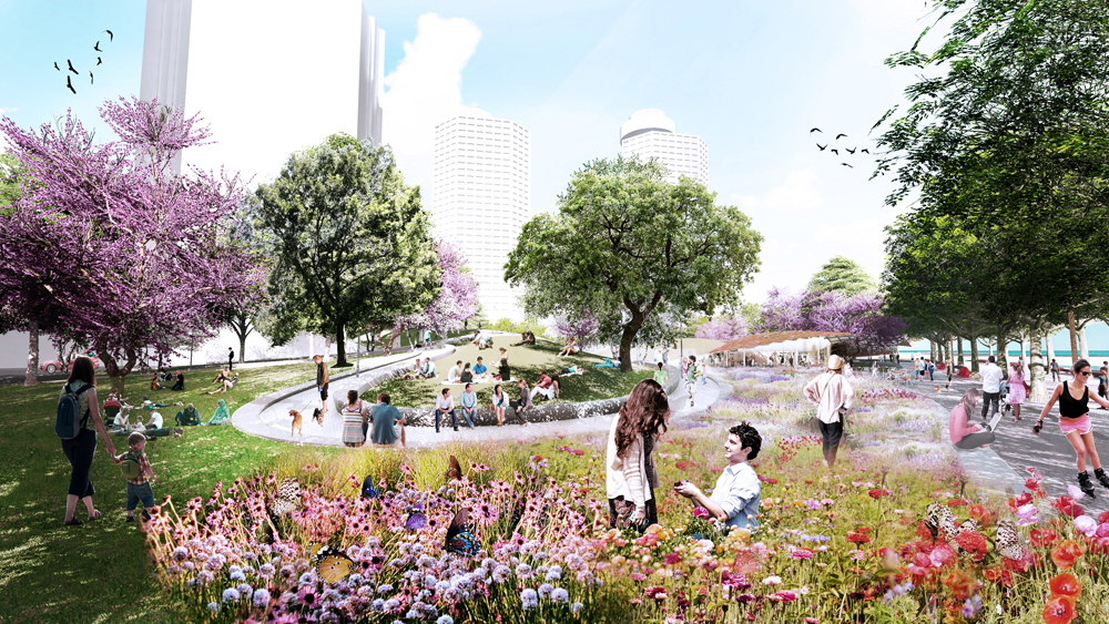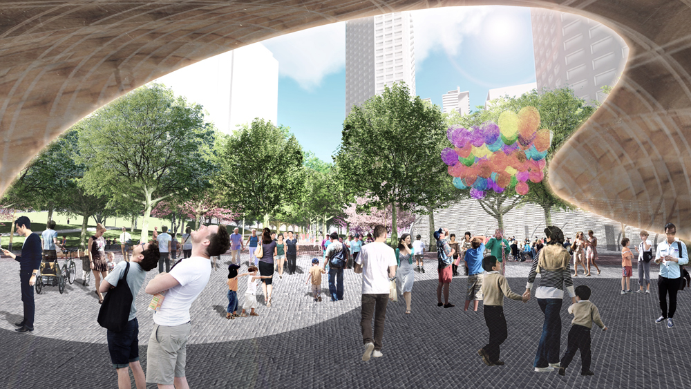 La proposition lauréate de KPMB Architects, West 8 et Greenberg Consultants suggère un nouvel édifice à la toiture végétalisée ondulée, en plus de créer de généreux espaces verts pour les passants.