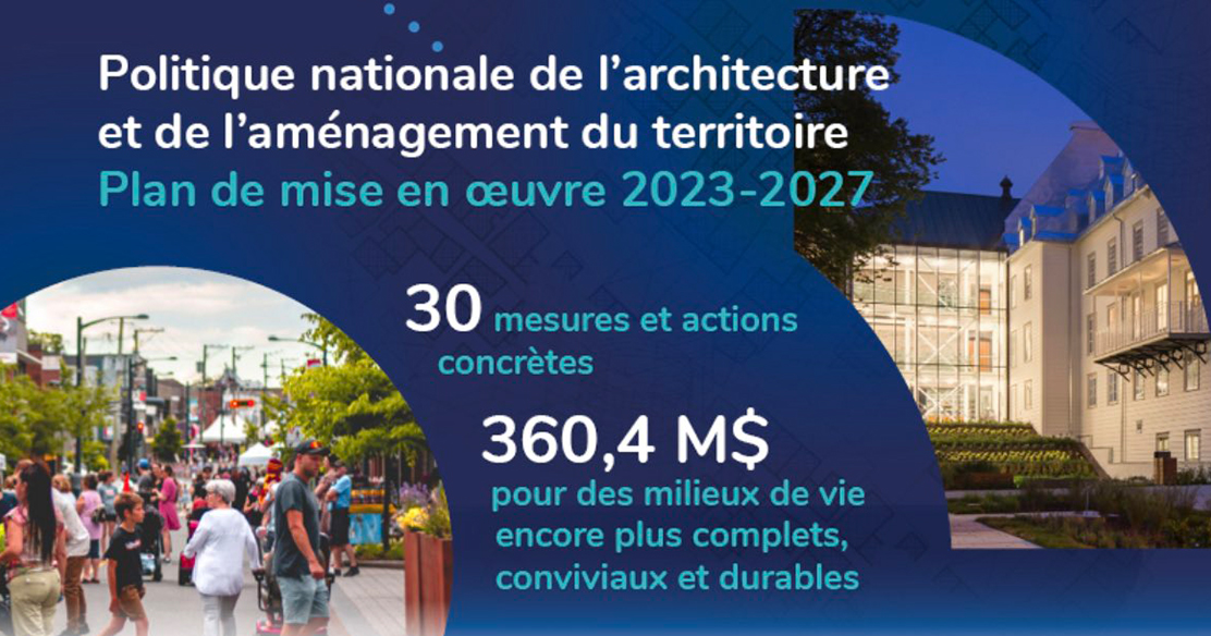 « Le gouvernement provincial a dévoilé le 26 juin dernier le plan de mise en œuvre (PMO) pour appliquer la Politique nationale de l’architecture et de l’aménagement du territoire (PNAAT), publié en 2022. Une enveloppe de 360,4M$ sera allouée à la mise en œuvre de cette politique.
