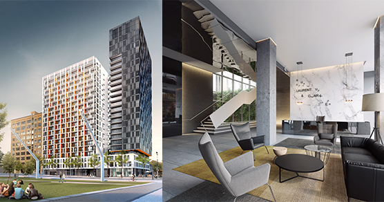 Située dans le Quartier des spectacles, la première phase de cet important projet immobilier dont la livraison est prévue pour 2019 comprendra 159 condominiums répartis sur 21 étages.
