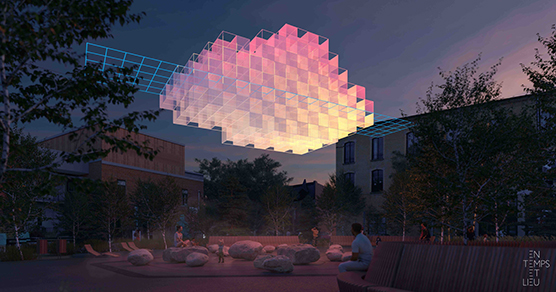 L’installation Partiellement nuageux avec de fortes probabilités de « wow »! est un concept hybride, qui se situe entre la nature et l’urbanité, l’organique et le technologique, l’ombre et la lumière, la science météorologique et les croyances populaires face à la météo. L’œuvre souligne la présence de l’eau, en lien avec le concept d’espace multifonctionnel inondable (« water square ») de la nouvelle Place des Fleurs-de-Macadam. Ainsi, un petit nuage cubique sera posé sur une trame bleue qui flottera au-dessus de la Place, évoquant un horizon. Le cumulus vaporeux filtrera doucement la lumière pour former des zones ombragées qui se déplaceront lentement avec la course du soleil. Le soir venu, une tout autre expérience se révèlera aux usagers : l’installation sera connectée en temps réel à son environnement : la mise en lumière évoluera en fonction des prévisions météos réelles : canicule, orage, pluie, grand soleil, etc. L’œuvre sera éclairée dans une palette de couleurs irisées, propres à chacun des scénarios météo prévus. »