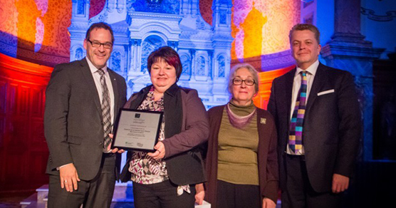 Prix Restauration Fabrique de la paroisse Saint-Damase (Bas-Saint-Laurent): Restauration de l’église et mobilisation de la population locale. Sur la photo : Monsieur Simon Prévost, vice-président Clientèle institutionnelle – Caisse centrale Desjardins, madame Élisabeth Michaud, administratrice de la fabrique de la Paroisse Saint-Damase, madame Josette Michaud, architecte et membre du jury, monsieur Jean Bissonnette, sous-ministre adjoint, Ministère de la Culture et des Communications du Québec.