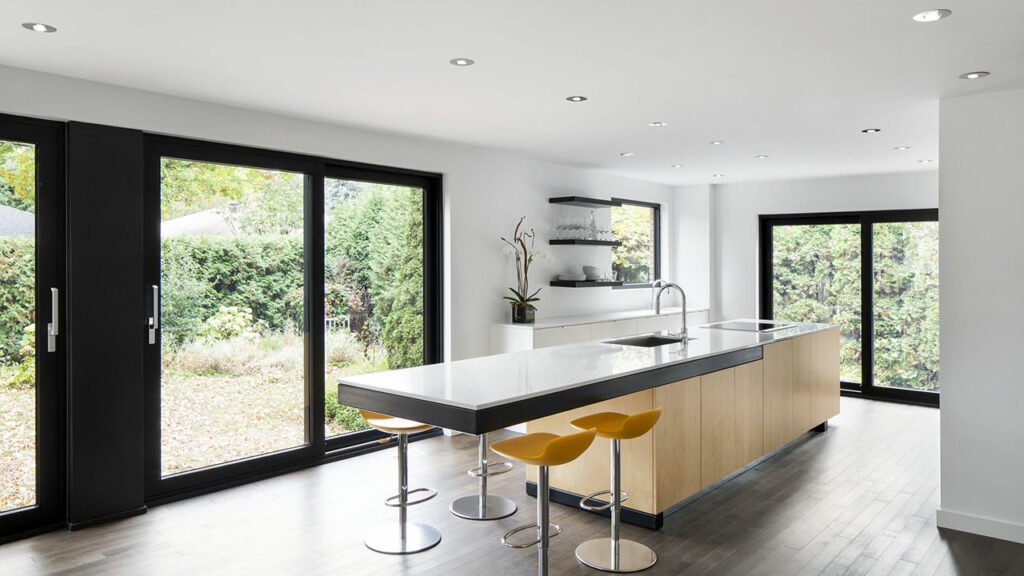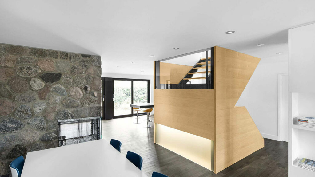 Le premier geste fut d’ouvrir de grandes fenêtres coulissantes sur la cour arrière côté sud. Pour faire pénétrer cette lumière profondément dans l’espace, un nouvel escalier central très ouvert remplace l’existant. Cet escalier, composé d’acier brut, de placage d’érable et de verre blanchi, devient le nouvel élément sculptural agissant comme point focal de l’ensemble de la maison. Unissant cuisine et salle à manger, un long comptoir de préparation se transforme en table à manger grâce à un porte-à-faux de 2.4m de long.