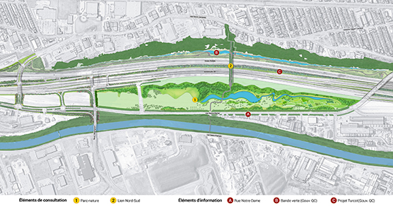 « Nous avions le mandat de tenir une consultation «afin de connaître les besoins et les attentes de la population concernant le développement et l’aménagement d’un grand parc dans l’écoterritoire de la falaise Saint-Jacques.» Le projet, situé dans le secteur de l’échangeur Turcot, à la limite des arrondissements du Sud-Ouest, de Côte-des-Neiges—Notre-Dame-de-Grâce et de LaSalle, repose sur trois grands éléments, soit l’aménagement d’un parc-nature, la réalisation, en collaboration avec le ministère des Transports, de la Mobilité durable et de l’Électrification des transports (MTMDET), d’une infrastructure permettant l’implantation d’un lien nord-sud pour les cyclistes et les piétons (projet précédemment connu sous le nom de «dalle-parc Turcot»), ainsi que la création d’une entrée de ville verdoyante, emblématique et innovante.