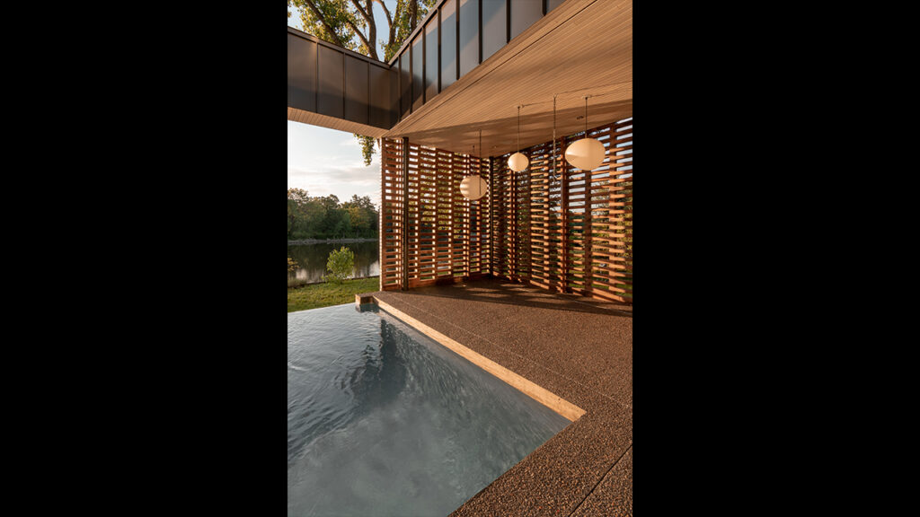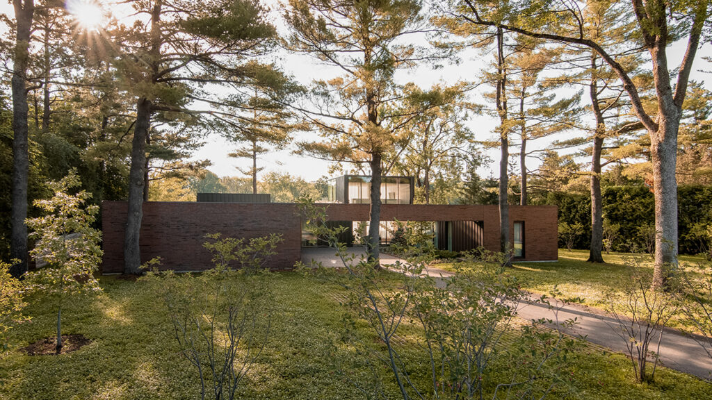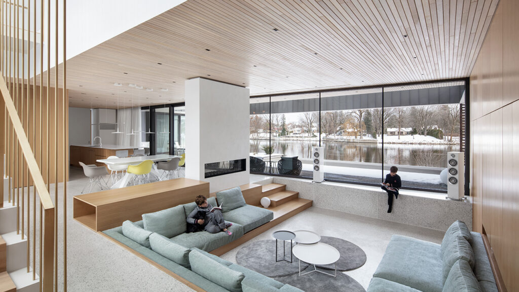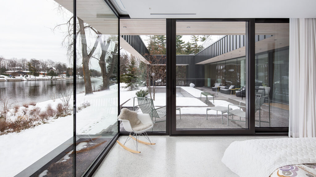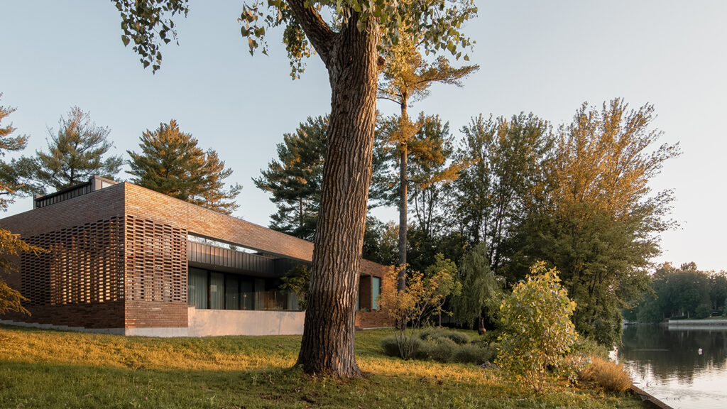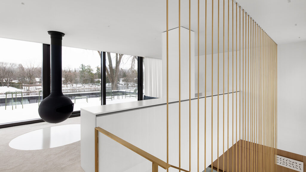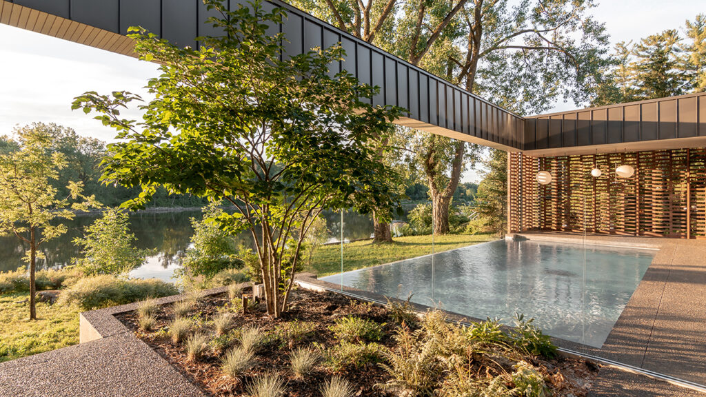 Conçu pour un couple et leurs deux enfants, la Résidence de l’Isle est une réinterprétation des maisons américaines modernes du milieu du 20e siècle. Cette maison unifamiliale construite sur le bord d’une rivière, dans la banlieue nord de Montréal, est le résultat d’une conversation architecturale avec les projets et le travail des architectes de cette époque. Dissimulée derrière une rangée de grands pins matures, son implantation permet à la végétation arbustive existante de faire partie intégrante du projet tout en optimisant les vues sur l’eau.