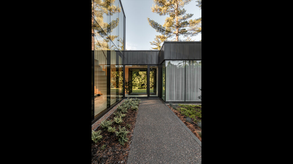 L’implantation en retrait de la résidence permet de reprendre les alignements qui préexistaient sur le site et de conserver autant d’arbres que possible. À l’avant, intégré au cœur de la première cour aménagée et donnant accès aux voitures, des conifères ont été plantés au centre de celle-ci. La répartition programmatique des espaces intérieurs prend en considération la relation avec la rue, la relation avec la rivière, l’orientation solaire et les besoins spécifiques des habitants. Aussi, l’espace du salon a été surbaissé de quelques marches et un édicule de verre a été installé sur la toiture. Pensée au départ comme une maison de plain-pied, cette dernière propose une variété d’expériences spatiales.
