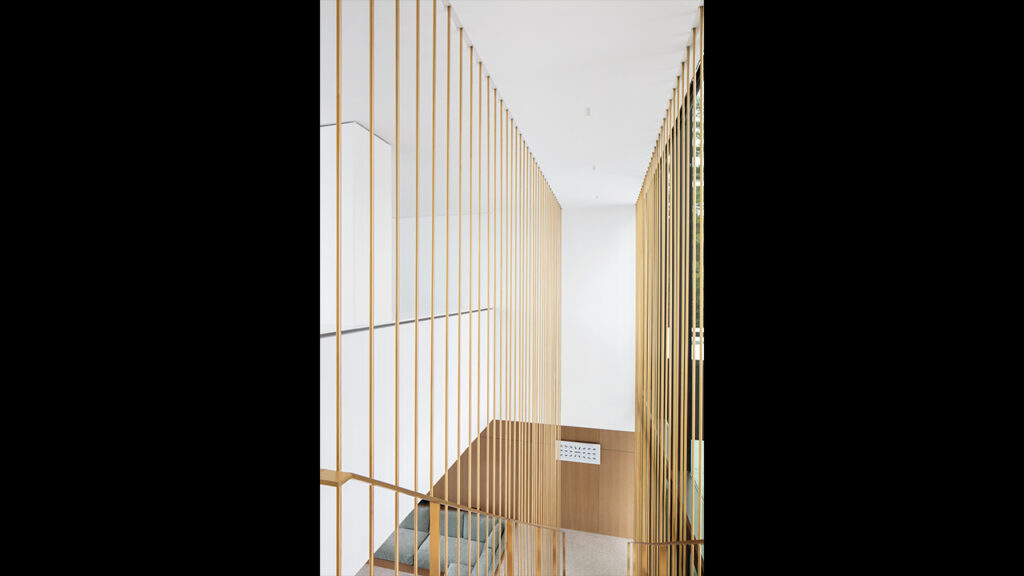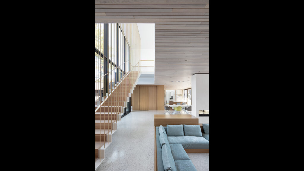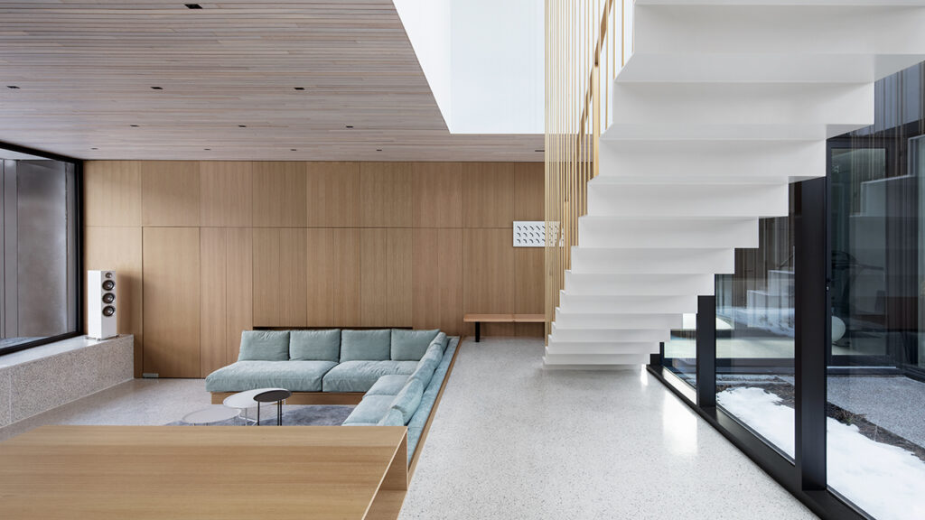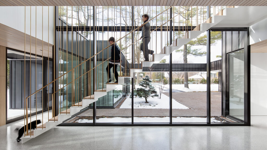 L’escalier suspendu avec sa plaque d’acier pliée est presque une œuvre d’art en soi, tandis que les prémisses d’aménagement paysagé laissent présager de superbes jardins contemplatifs dans les années à venir.