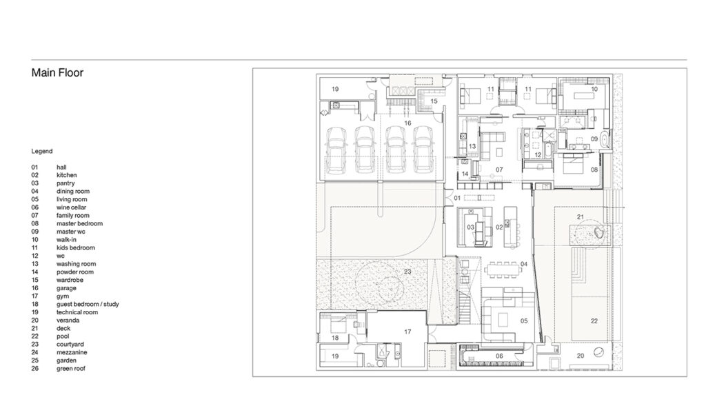 Afin de revisiter de façon contemporaine quelques-uns des éléments clés du modernisme, la topographie du plancher et des plafonds, le mobilier intégré en bois et les revêtements en maçonnerie sont retravaillés. Le garage, reflet d’une époque où banlieue et automobile rimaient avec progrès et enthousiasme, est directement intégré dans la maison qui forme un carré parfait de 100 pieds. La question de l’intimité et des ouvertures, cruciales dans les années 1950, permet de créer, deux cours intérieures rectangulaires. Elles s’insèrent dans le volume afin d’amener de la lumière naturelle en plein cœur de la résidence, mais aussi d’incorporer la terrasse arrière et la piscine. Ces espaces extérieurs extrudés de la masse initiale servent également à définir et à structurer la géométrie de l’espace intérieur. Le carré de 100 pieds par 100 pieds est en contact avec un extérieur construit et intériorisé situé à l’avant-plan d’un décor naturel presque laissé en friche au-delà des frontières de la maison.