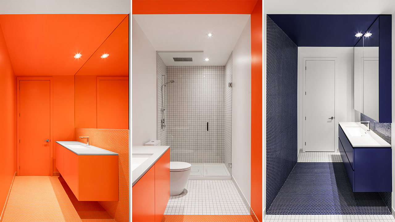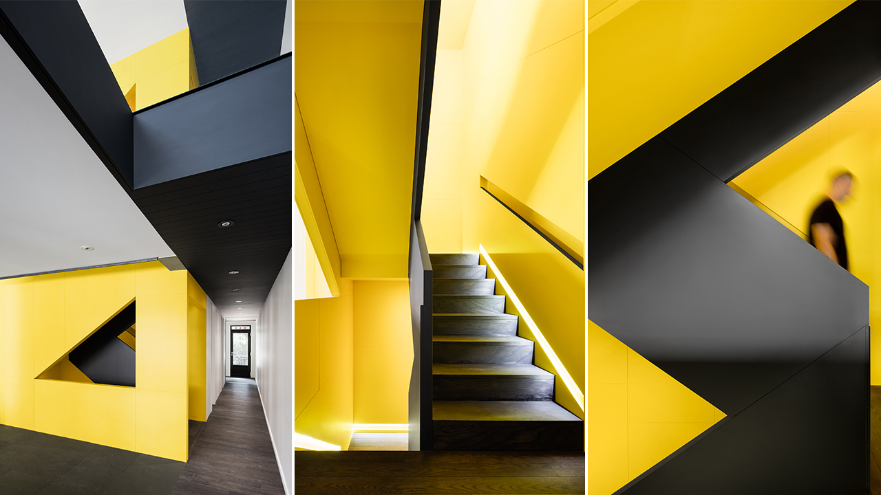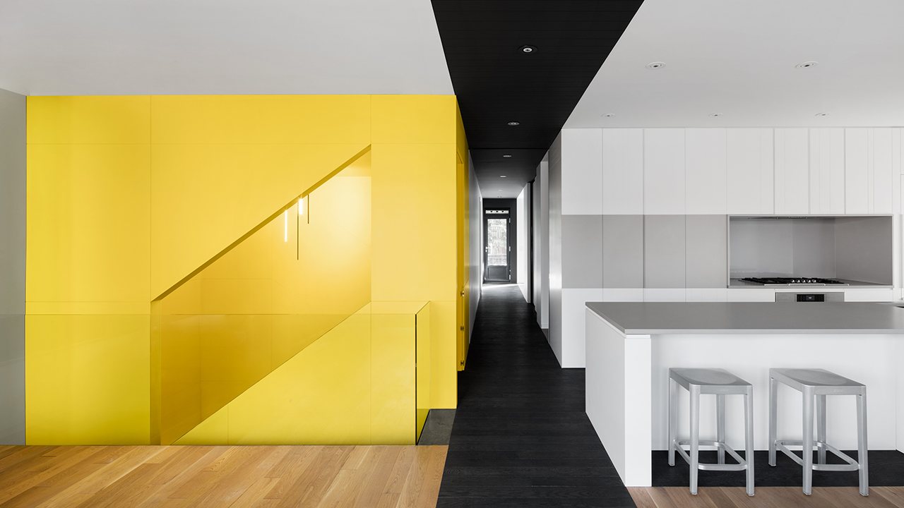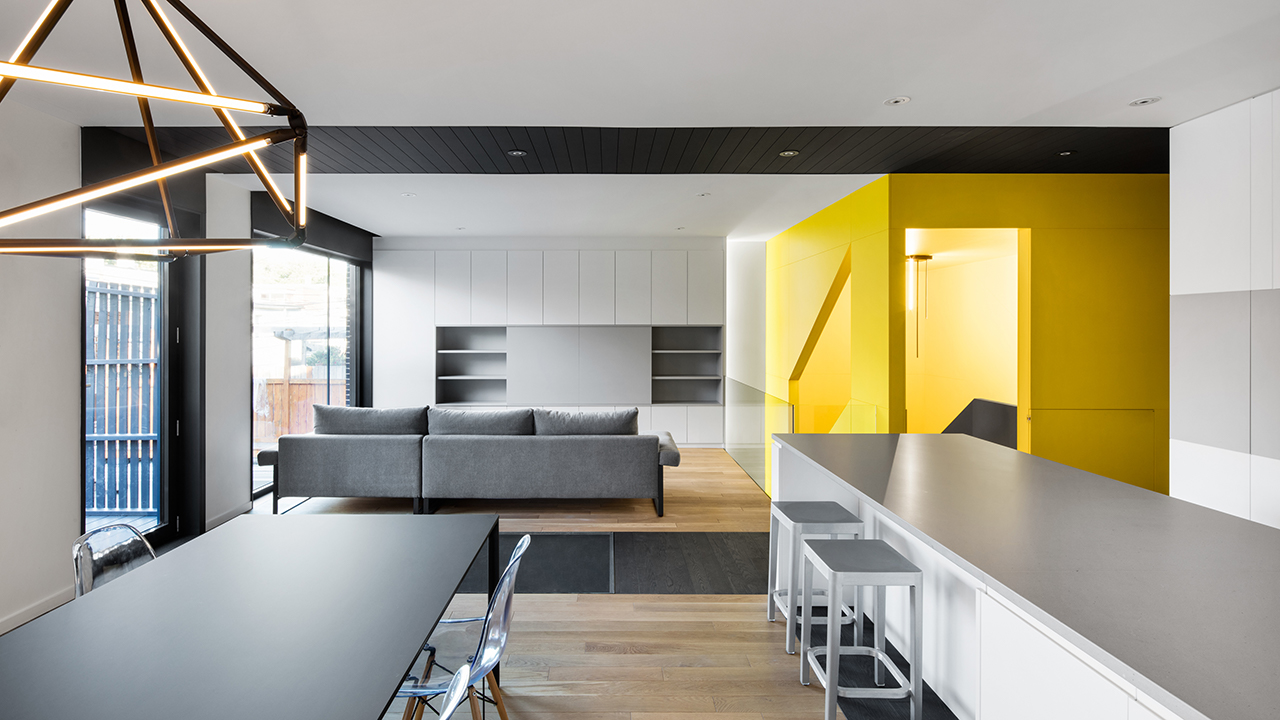Le contraste entre les palettes neutres et vives utilisées pour la Canari House ne dissocie pas seulement les espaces servants des espaces servis, il permet aussi la juste appréciation de ces couleurs choisies. Tout comme le noir révèle le jaune, le blanc révèle le veinage doux du sol en chêne blanc coupé sur quartier de la salle à manger. L’utilisation de la couleur donne ainsi son identité à chacune des pièces par la mise en valeur de sa volumétrie et des matériaux employés. Ainsi délimités, les espaces communs n’ont pas besoin d’être cloisonnés et peuvent s’ouvrir complètement comme le souhaitaient les clients.