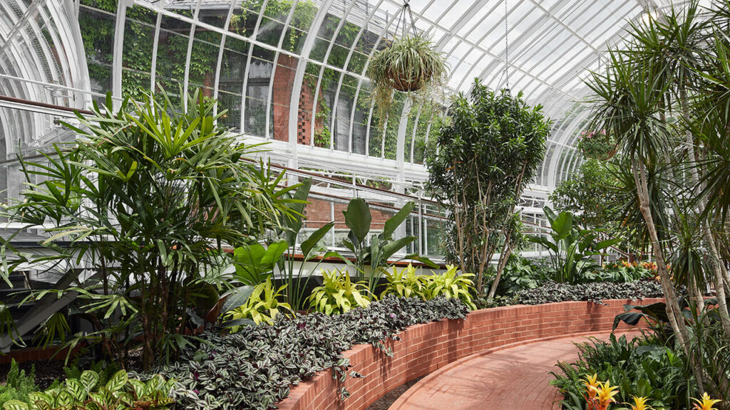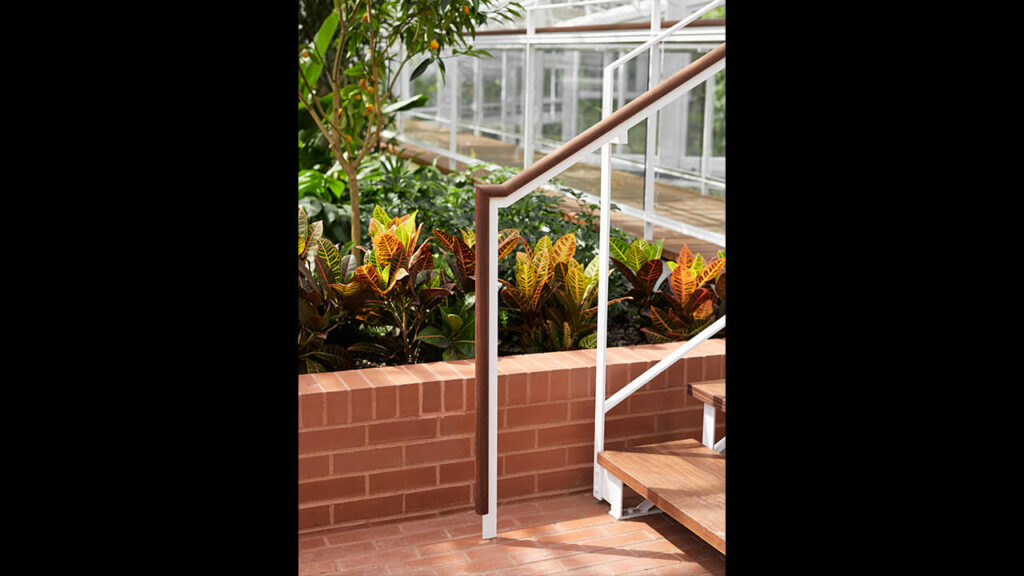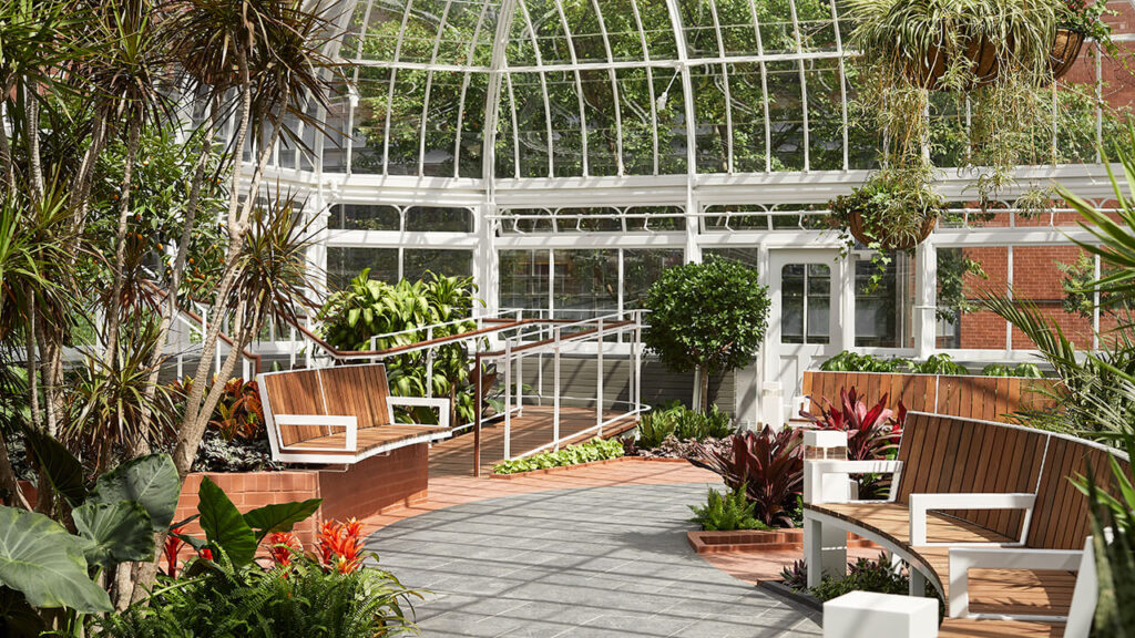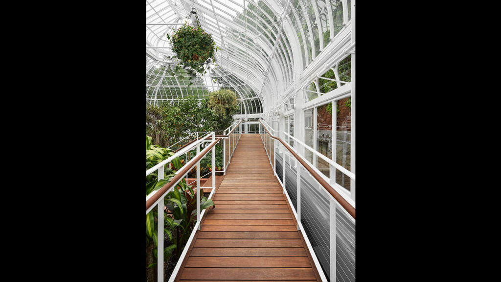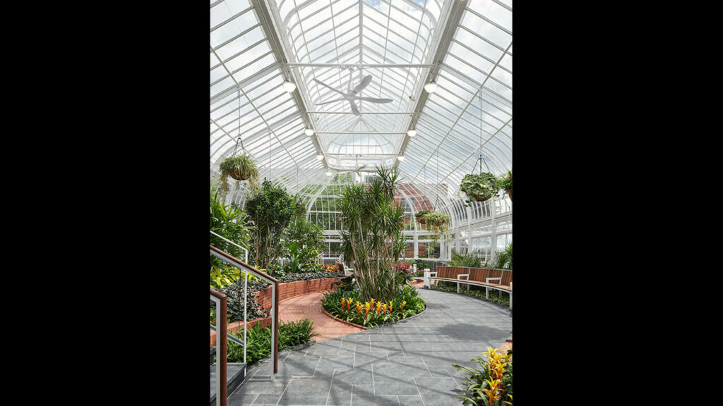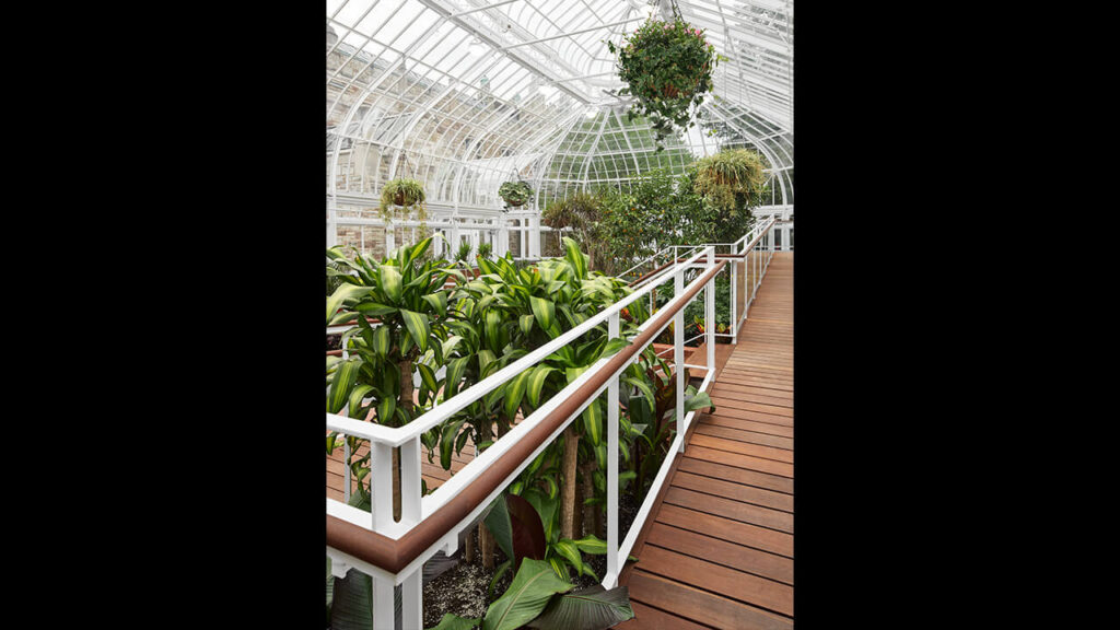 Au-delà de l’enjeu patrimonial et historique de la restauration des serres, la programmation de l’aménagement intérieur et l’accessibilité des lieux sont devenues des enjeux importants. C’est dans cette optique que les développements préalables du projet ont mené à la définition d’un programme qui diverge avec la vocation plus spécialisée et le plan d’origine de la « Palm House ». Ce programme vise à accommoder des usages qui se sont imposés d’eux-mêmes au fil du temps et qui ont investi les lieux, tels qu’espace de rencontre pour petits groupes, lieu de discours, interprétation des plantes avec étudiants, moments de musique et photos de mariages. Les serres sont devenues un lieu qui se prête à divers scénarios d’occupation, tout en remplissant leur rôle premier de serres d’exposition. De plus, elles agissent comme un lien fondamental facilitant l’accès universel aux quatre saisons du centre communautaire vers la bibliothèque.