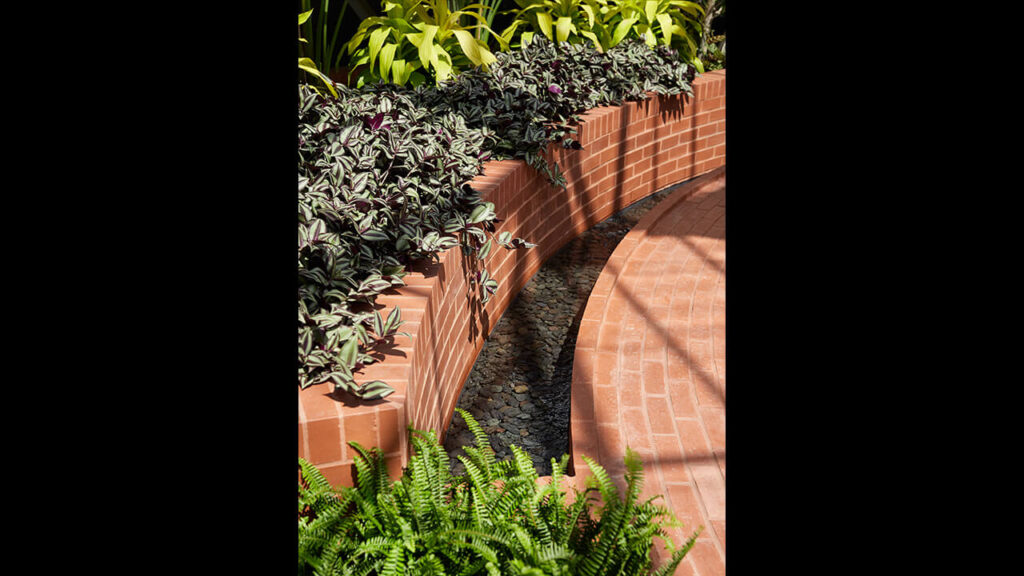 Le concept d’aménagement élaboré adopte le jumelage de la contrainte de réalisation d’un important parcours d’accès à la réalisation d’un circuit de découverte dans la serre. Cette stratégie permet la pleine expérience du paysage intérieur. Tel un quai, la rampe intérieure flotte au-dessus des plantations et permet divers points de vue tout en menant le visiteur au niveau de la bibliothèque. Traitements de niveaux, murets et jeux d’eau enrichissent l’expérience. Le zonage des aires permet à la fois le développement de plantes permanentes, telles que l’oranger, et la rotation de plantations colorées qui mettent en valeur les plantes saisonnières.