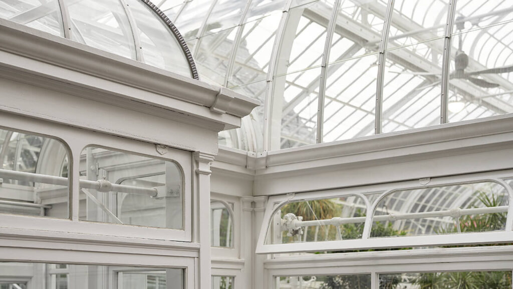 - L’enveloppe des serres : réfections, restauration ou remplacement d’éléments des fondations aux épis d’ornement au sommet de la verrière.